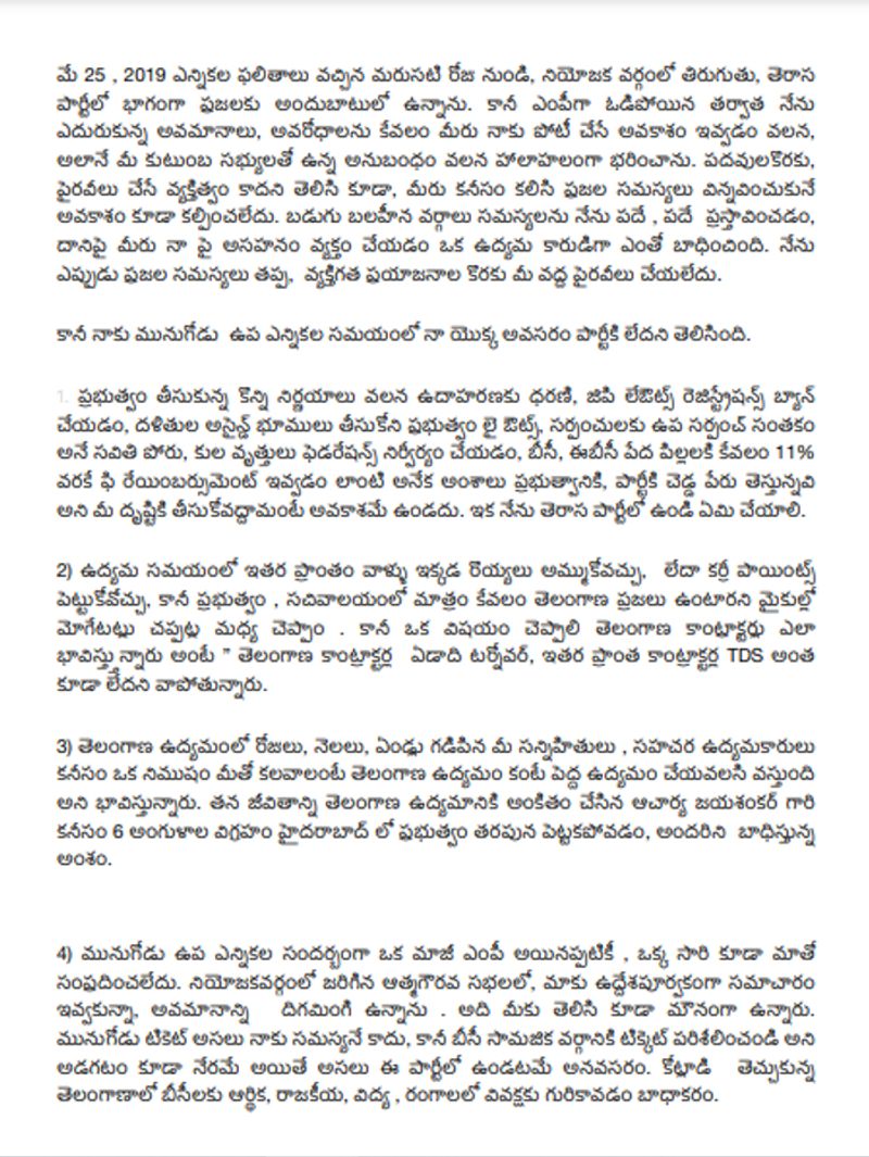 టీఆర్ఎస్ పార్టీకి మాజీ ఎంపీ బూర నర్సయ్య గౌడ్ రాజీనామా చేశారు. టీఆర్ఎస్ పార్టీ సభ్యత్వానికి రాజీనామా చేస్తూ పార్టీ అధ్యక్షునికి బూర నర్సయ్య గౌడ్ లేఖ రాశారు. ఈ లేఖలో బూర నర్సయ్య గౌడ్ పలు అంశాలను ప్రస్తావించాడు. తాను పార్టీలో వ్యక్తిగతంగా అవమానపడ్డానని చెప్పారు. తనకు సమాచారం ఇవ్వకుండా మునుగోడు అభ్యర్థిని ప్రకటించారని.. ఆత్మగౌరవ సభలకు ఉద్దేశపూర్వకంగానే సమాచారం ఇవ్వలేదని పేర్కొన్నారు. తెలంగాణలో బీసీలు వివక్షతకు గురవుతున్నారని ఆరోపించారు.