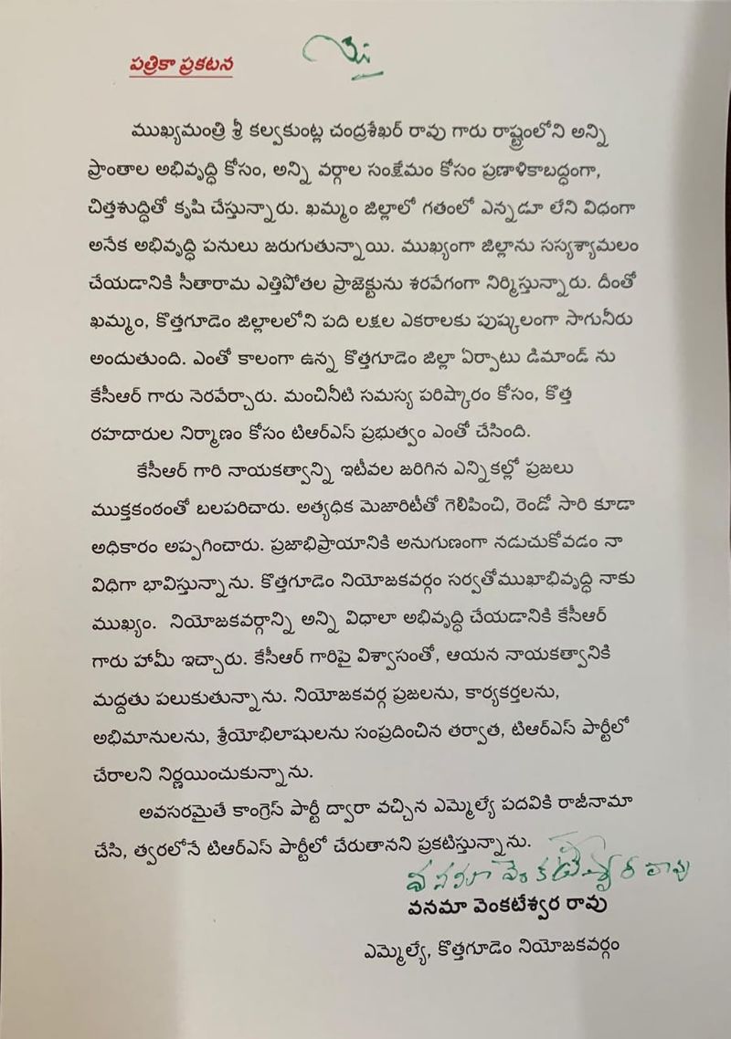 ఇదిలా ఉంటే తాజాగా కొత్త గూడెం ఎమ్మెల్యే వనమా వెంకటేశ్వరరావు కూడ కాంగ్రెస్ పార్టీకి గుడ్ బై చెప్పనున్నట్టు ప్రకటించారు.ఎన్నికల సమయంలో కొత్తగూడెం అసెంబ్లీ స్థానం నుండి పోటీకి సీపీఐ పట్టుబట్టింది. కానీ, ఈ స్థానం వదిలిపెట్టేందుకు కాంగ్రెస్ సిద్దపడలేదు.