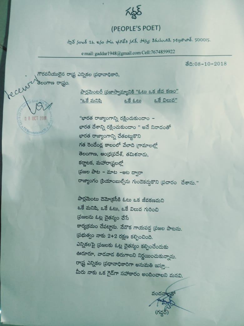 తానొక గాయపడ్డ ప్రజల పాటనన్న గద్దర్ తనకు గతంలో 2 ప్లస్ 2 సెక్యూరిటీని కూడా ప్రభుత్వం ఏర్పాటు చేసిందని గుర్తు చేశారు. తాను చేపట్టబోయే ప్రచారానికి అనుమతినిస్తూ సహాయ సహకారాలు అందించాలని గద్దర్ పాటరూపంలో కోరారు.