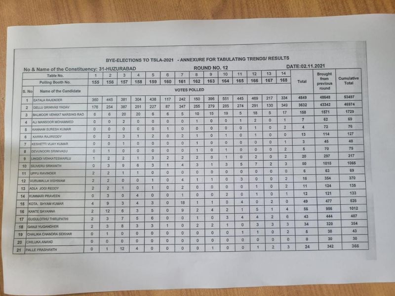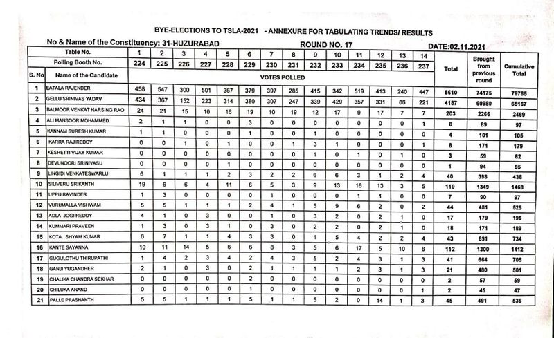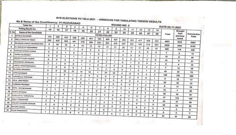 15వ రౌండ్ ముగిసేసరికి ఈటల పోటీచేసిపి బిజెపికి 68,586 ఓట్లు, గెల్లు శ్రీనివాస్ యాదవ్ పోటీచేసిన టీఆర్ఎస్ కు 57,003, కాంగ్రెస్ 1982 ఓట్లు వచ్చాయి.