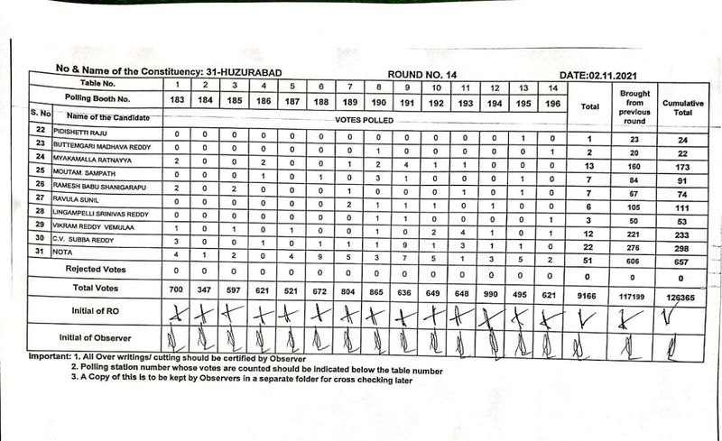 14వ రౌండ్ తర్వాత బిజెపికి 63079, టీఆర్ఎస్ కి 53627, కాంగ్రెస్ కి 1830 ఓట్లు వచ్చాయి.