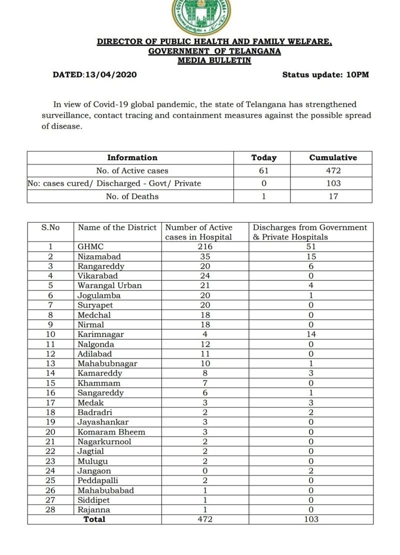 రాష్ట్రంలోని 28 జిల్లా ల్లో కరోనా కేసులు నమోదయ్యాయి. జీహెచ్ఎంసీ పరిధిలో అత్యధికంగా కేసులు ఉండగా.. ఆ తరువాత స్థానంలో నిజామాబాద్ జిల్లా ఉంది. వికారాబాద్, వరంగల్ అర్బన్, జోగులాంబ గద్వాల, సూర్యాపేట, మేడ్చల్, నిర్మల్, కరీంనగర్, నల్లగొండ, ఆదిలాబాద్, మహబూబ్నగర్, కామారెడ్డి జిల్లాల్లో అధికంగా పాజిటివ్ కేసులు నమోదయ్యాయి. జంటనగరాల పరిధిలో అత్యధికంగా 216 కేసులు ఆక్టివ్ గా ఉండడం ఇక్కడ ఆందోళన కలిగించే అంశం.