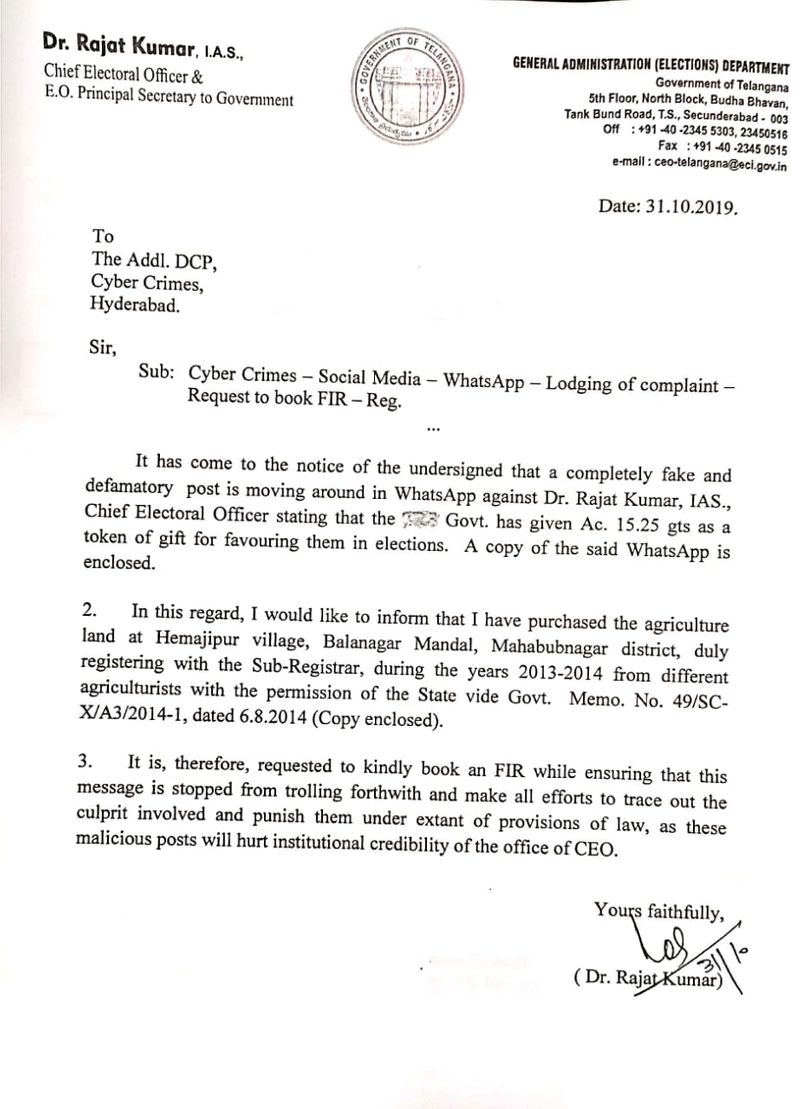 మహబూబ్ నగర్ జిల్లా బాలానగర్ మండలం హేమాజీపూర్ గ్రామంలో భూమి కొనుగోలు చేసినట్లు ప్రచారం చేసినట్లు తెలిపారు. హేమాజీపూర్ గ్రామంలో కొనుగోలు చేసినట్లు వన్ బీ నమూనాను సైతం సోషల్ మీడియాలో సర్క్యూలేట్ చెయ్యడంపై రజత్ కుమార్ ఆగ్రహం వ్యక్తం చేశారు.