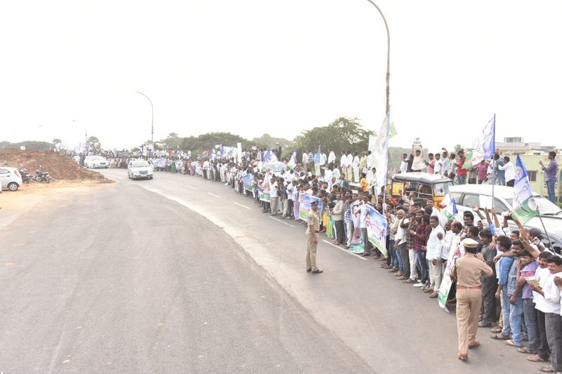 సీఎం విశాఖ నగర పర్యటన సందర్భంగా దాదాపు 24 కిలోమీటర్ల మేర ప్రజలు భారీ మానవహారం నిర్వహించారు. విశాఖ విమానాశ్రయం నుంచి ఎన్ఏడీ జంక్షన్, కంచరపాలెం, తాటిచెట్లపాలెం, రైల్వేస్టేషన్ రోడ్డు, తెలుగుతల్లి ఫ్లైఓవర్, సిరిపురం జంక్షన్, చిన వాల్తేరు, కురుపాం టూంబ్, అప్పూ ఘర్ జంక్షన్ మీదుగా కైలాసగిరి వరకు గతంలో ఎప్పుడూ లేని విధంగా మానవహారంలా నిలబడి సీఎంకు కృతజ్ఞతా పూర్వక స్వాగతం పలికారు.
