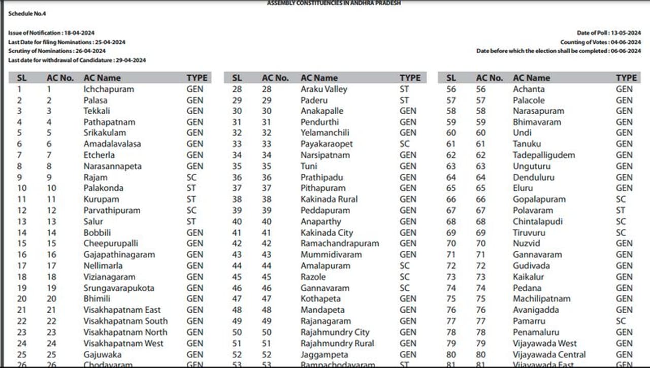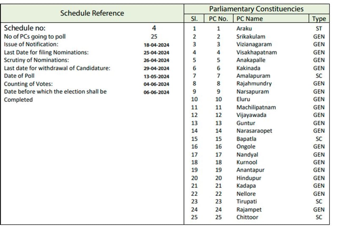 ఆంధ్ర ప్రదేశ్ లోని 175 అసెంబ్లీ సీట్లు, 25 పార్లమెంట్ సీట్లకు ఒకే విడతలో ఎన్నికలు జరగనున్నారు. ఆంధ్ర ప్రదేశ్ లో ఏప్రిల్ 18న ఎన్నికల నోటిఫికేషన్, మే 13న పోలింగ్ జరపనున్నట్లు ఈసి ప్రకటించింది. అభ్యర్థుల నామినేషన్ల గడువు ఏప్రిల్ 25.... నామినేషన్ల స్క్రూటినీ ఏప్రిల్ 26, నామినేషన్ల ఉపసంహరణ చివరితేదీ ఏప్రిల్ 29. ఎన్నికల కమీషన్ ప్రకటనతో ఆంధ్ర ప్రదేశ్ లో ఎలక్షన్ కోడ్ అమల్లోకి వచ్చింది.