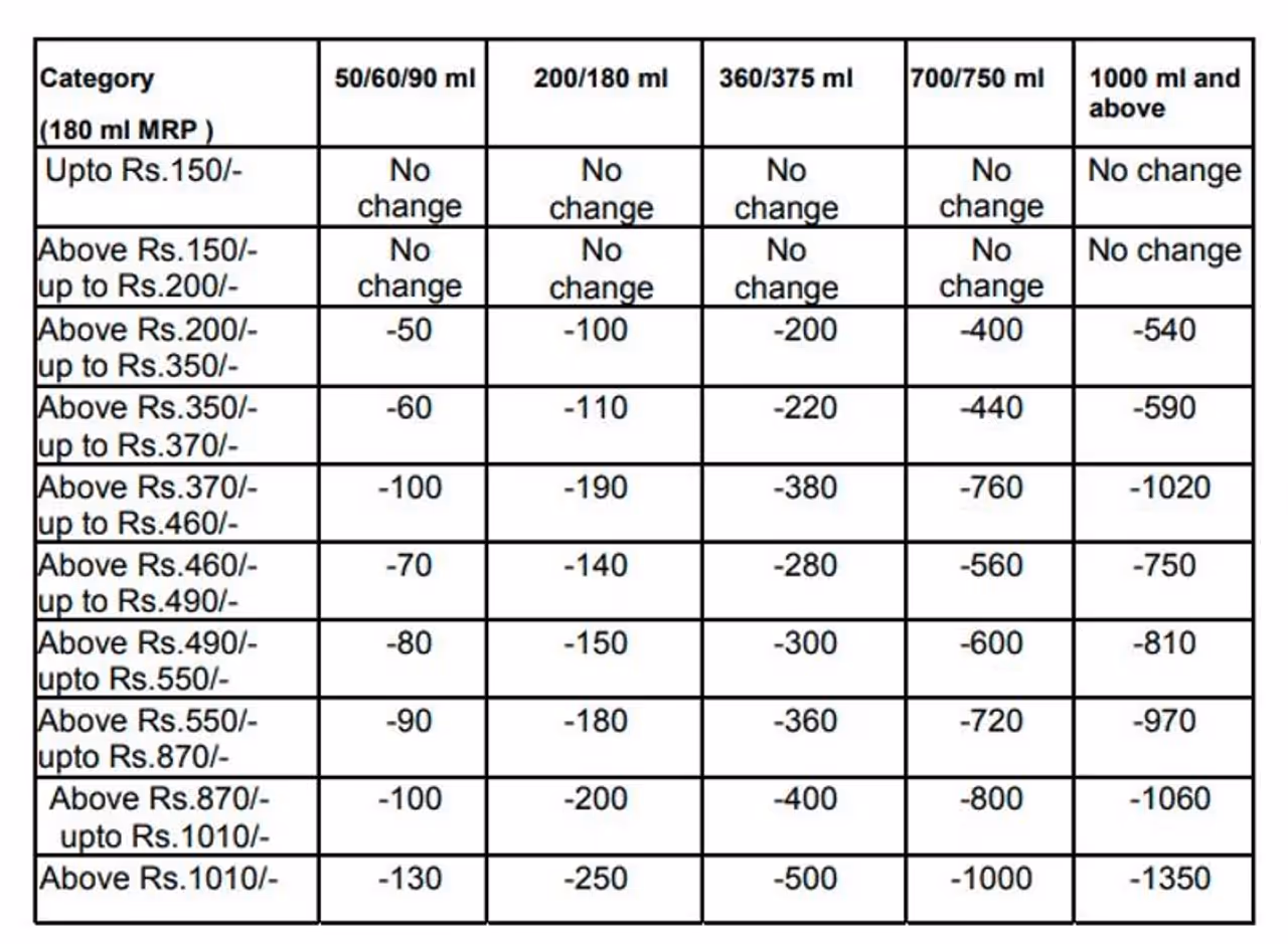 రాష్ట్రంలో మద్యం ధరల తగ్గుదల ఇలా ఉంది.
