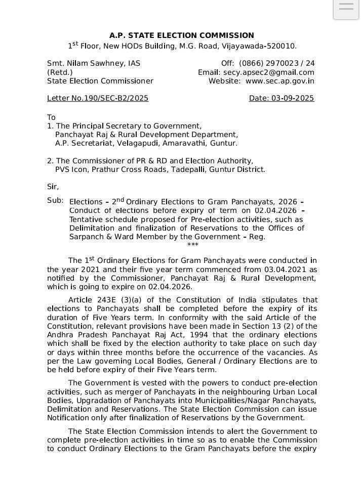 ఆంధ్ర ప్రదేశ్ ఎన్నికల నగారా మోగింది. స్థానిక సంస్థల ఎన్నికలకు ఇంకా సమయం ఉన్నా ముందస్తుగానే వీటిని నిర్వహించడానికి కూటమి ప్రభుత్వం సిద్దమయ్యింది. ఈ మేరకు రాష్ట్ర ఎన్నికల సంఘానికి సమాచారం అందించగా అందుకు అంగీకరించిన ఈసి ఎలక్షన్స్ కి సంబంధించిన కీలక సమాచారం ప్రకటించింది... ఈ మేరకు ఏపీ ఎలక్షన్ కమీషనర్ నీలం సాహ్ని పేరిట అధికారిక ప్రకటన వెలువడింది.