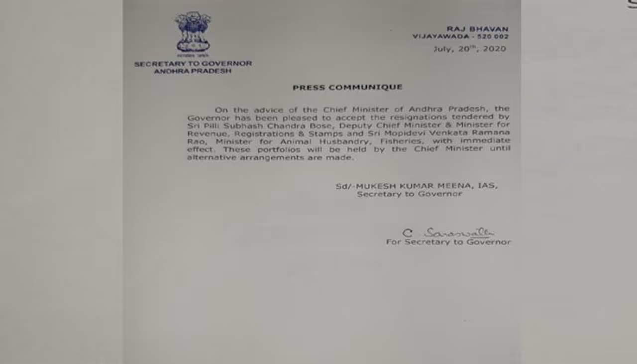 ఇటీవల రాజ్యసభకు ఎన్నికయిన మంత్రులు పిల్లి సుభాష్ చంద్రబోస్, మోపిదేవి వెంకటరమణల రాజీనామాలను ఏపి గవర్నర్ బిశ్వభూషణ్ హరిచందన్ ఆమోదించారు.