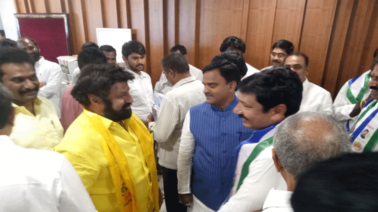ఈ కార్యక్రమానికి ముందు అసెంబ్లీ ఆవరణలో బాలకృష్ణ కాసేపు సందడి చేశారు. తమ పార్టీ ఎమ్మెల్యేలతోపాటు... వైసీపీ ఎమ్మెల్యేలతో కూడా బాలయ్య కాసేపు ముచ్చటించారు. దీనికి సంబంధించిన ఫోటోలు ఇప్పుడు మీడియా ద్వారా బయటకు రాగా... నెట్టింట చక్కర్లు కొడుతున్నాయి.