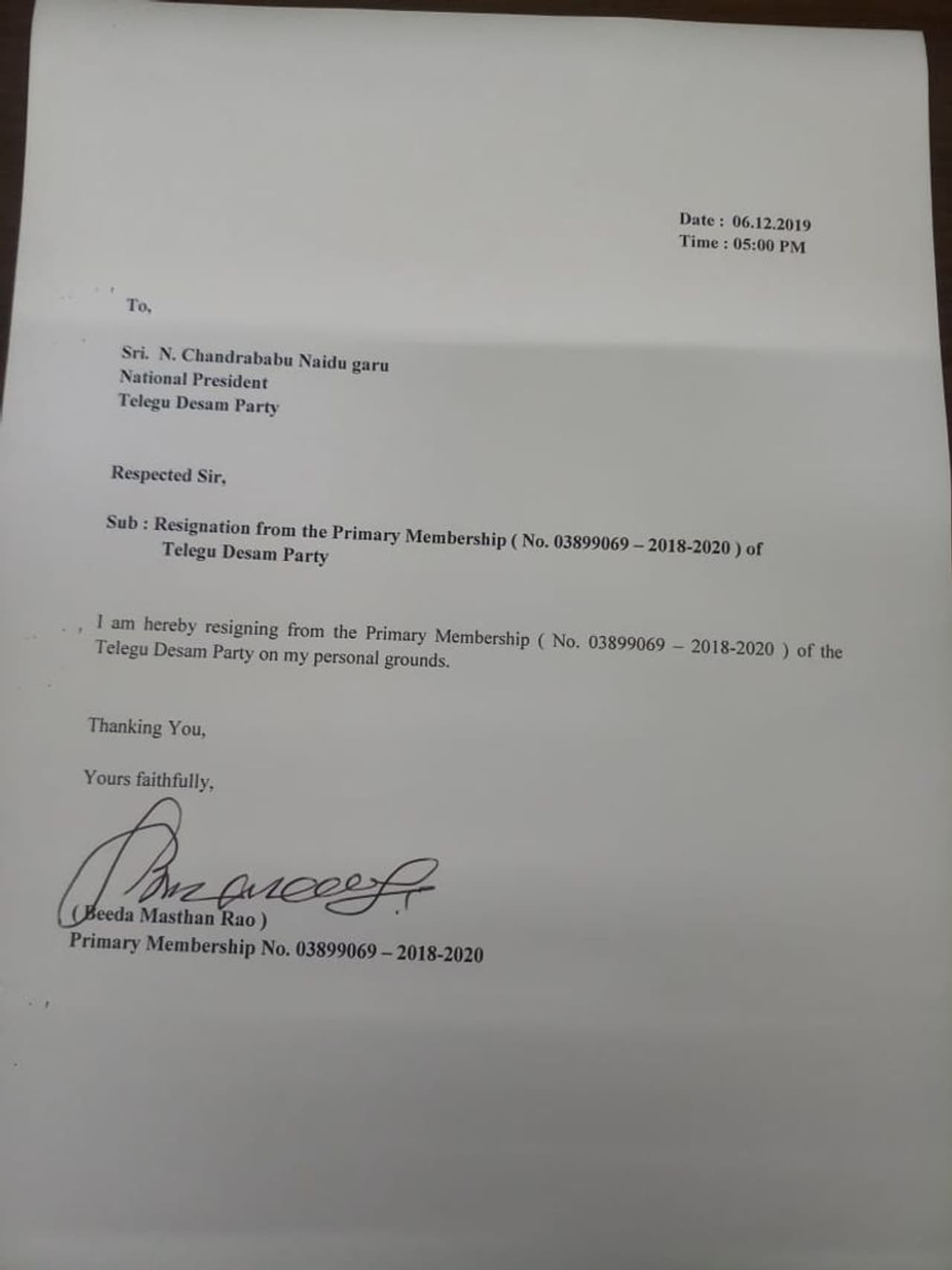 టీడీపీ నేత, మాజీ ఎమ్మెల్యే బీద మస్తాన్ రావు ఆ పార్టీకి రాజీనామా చేశారు. ఆయన వైసీపీలో చేరనున్నారు.