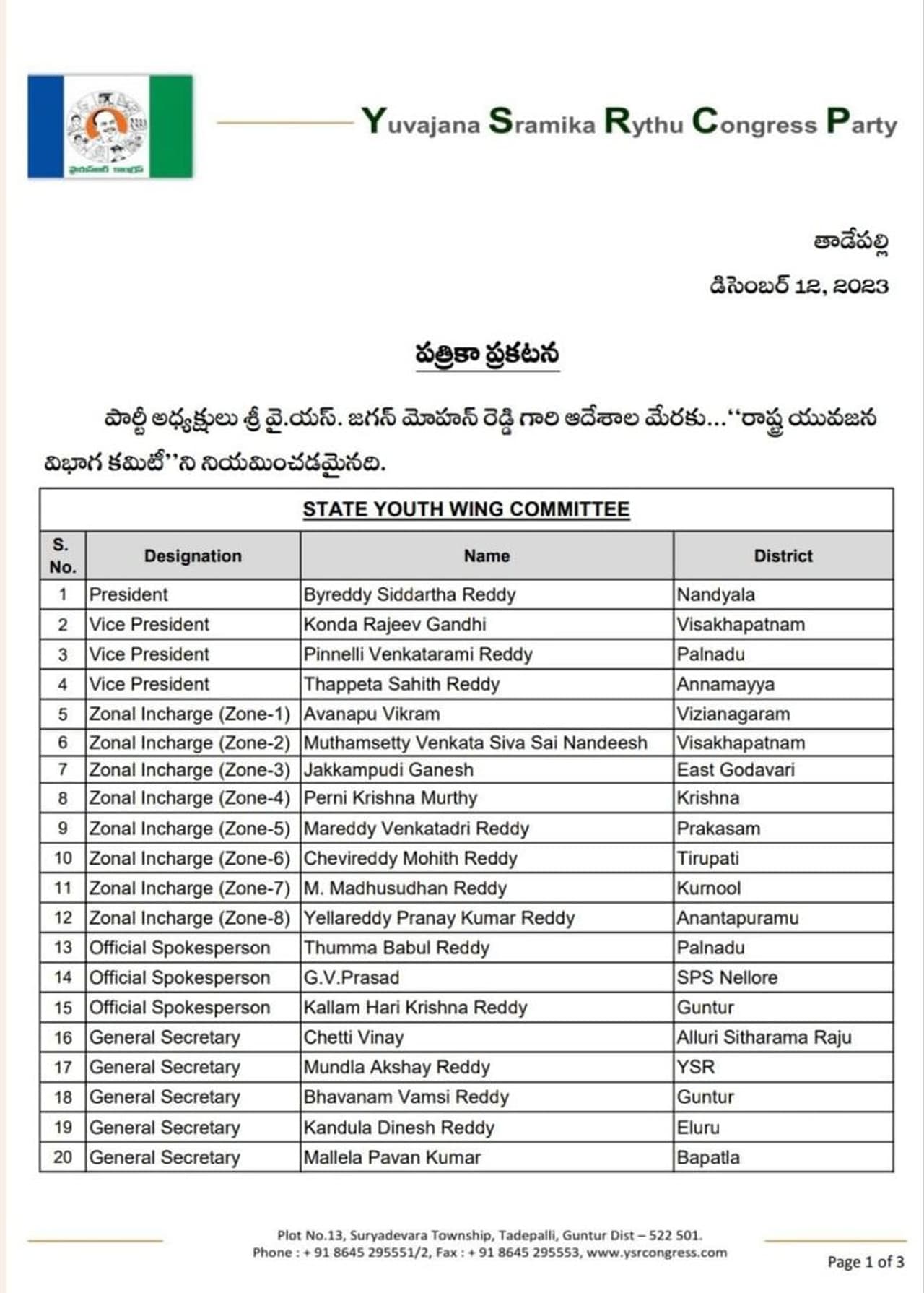 వైసిపి అధినేత వైఎస్ జగన్మోహన్ రెడ్డి ఆదేశాల మేరకు పార్టీ నూతన యువజన విభాగం కమిటీని ఏర్పాటుచేసారు. ఈ కమిటీ అధ్యక్షుడిగా బైరెడ్డి సిద్దార్థ్ రెడ్డి నే తిరిగి నియమించింది వైసిపి. అలాగే వివిధ జిల్లాలకు, సామాజిక వర్గాలను దృష్టిలో వుంచుకుని యువజన కమిటీలో ఇతర పదవులను కేటాయించారు. ఈ మేరకు యువజన కమిటీలో చోటు దక్కించుకున్నవారి పేర్లను వైసిపి కేంద్ర కార్యాలయం విడుదల చేసింది.