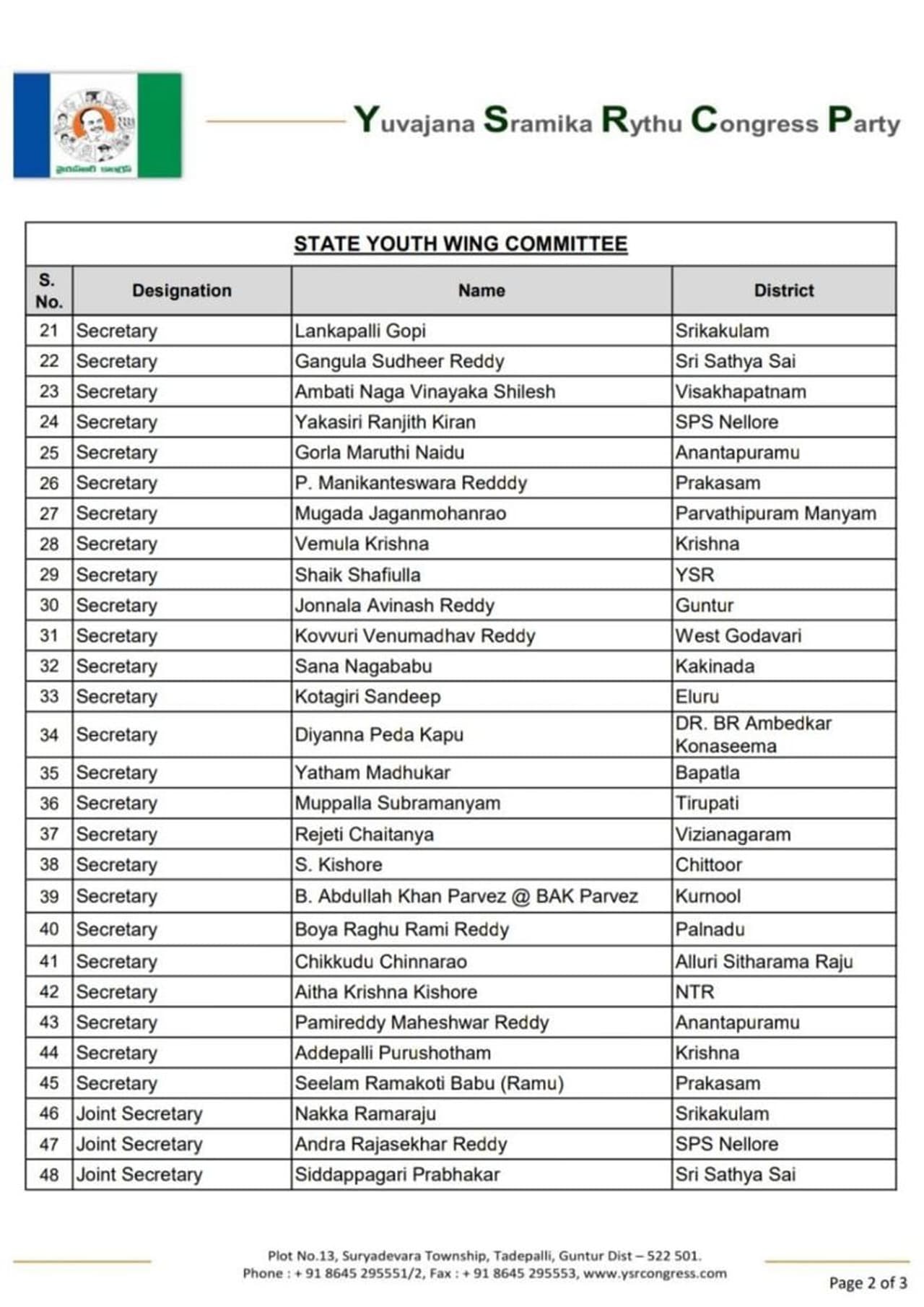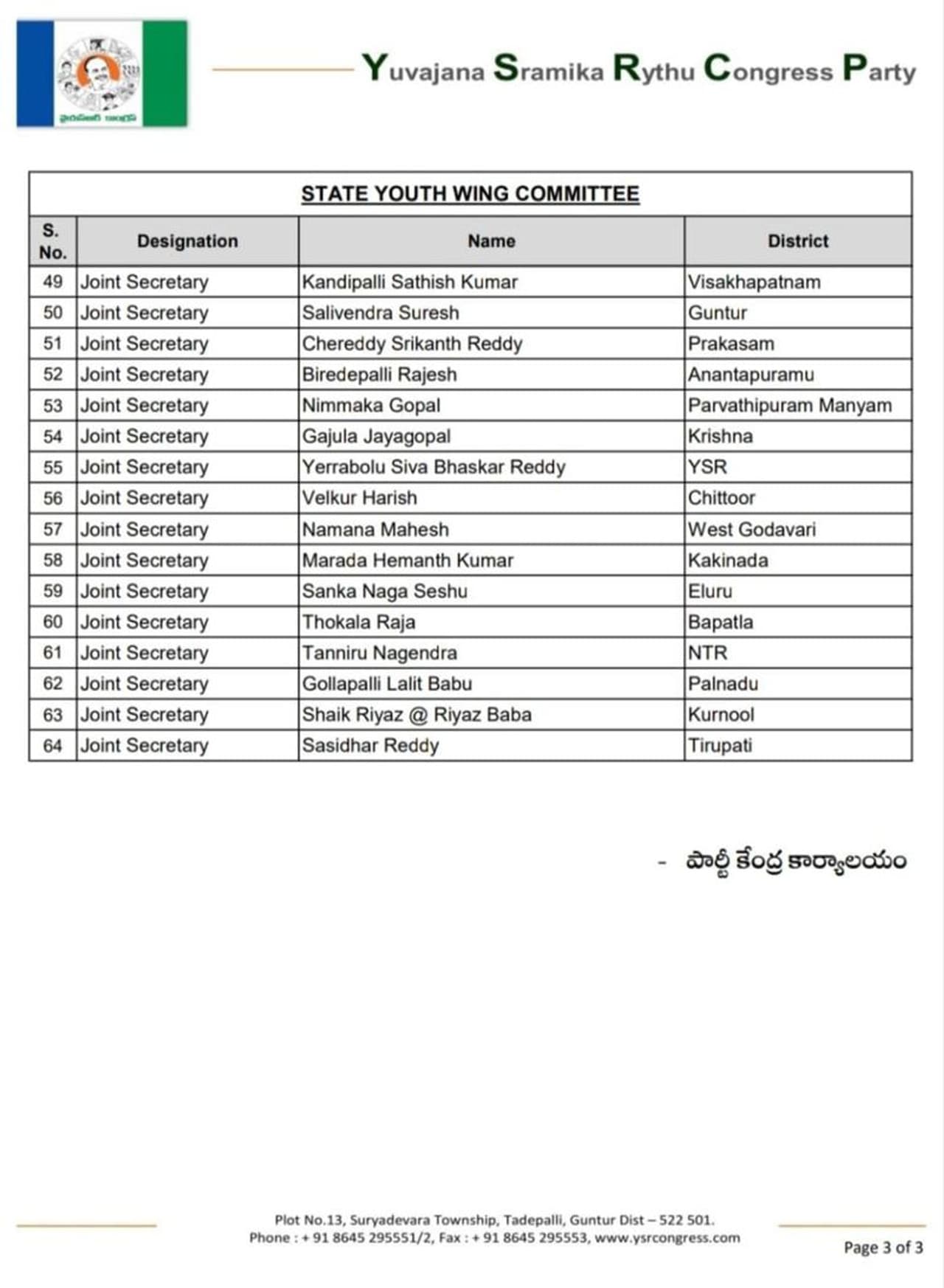 వైసిపి యువజన కమిటీ అధ్యక్ష బాధ్యతల మళ్ళీ బైరెడ్డికే దక్కగా ఉపాధ్యక్షులుగా కొండా రాజీవ్ రెడ్డి, పిన్నెల్లి వెంకటరామిరెడ్డి, తప్పెట్ల సాహిత్ రెడ్డి నిమమితులయ్యారు. ఇక రాష్ట్రం మొత్తాన్ని ఎనిమిది జోన్లుగా విభజించి వాటికి ఇంచార్జీలను నియమించారు. అలాగే ముగ్గురు అధికార ప్రతినిధులు, అయిదుగురు ప్రధాన కార్యదర్శులతో పాటు కార్యదర్శులు, ప్రధాన కార్యదర్శులు... ఇలా మొత్తం 64 మందితో కూడిన యువజన కమిటీని వైసిపి ప్రకటించింది.