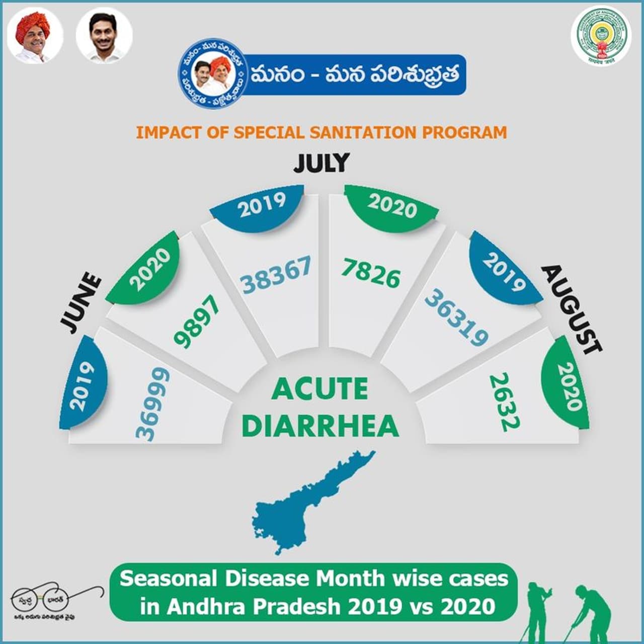 దాంతో అక్కడ ప్రతి ఏడు వచ్చే వ్యాధుల శాతంతో పోలిస్తే ఈ ఏడు ఆ శాతం భారీగా తగ్గటం గమనార్హం. మనం మన పరిశుభ్రత" కార్యక్రమాన్ని 5 లక్షల 50 వేల ఇళ్లకు చేరేలా ఏపీ ప్రభుత్వం విజయవంతమైంది.