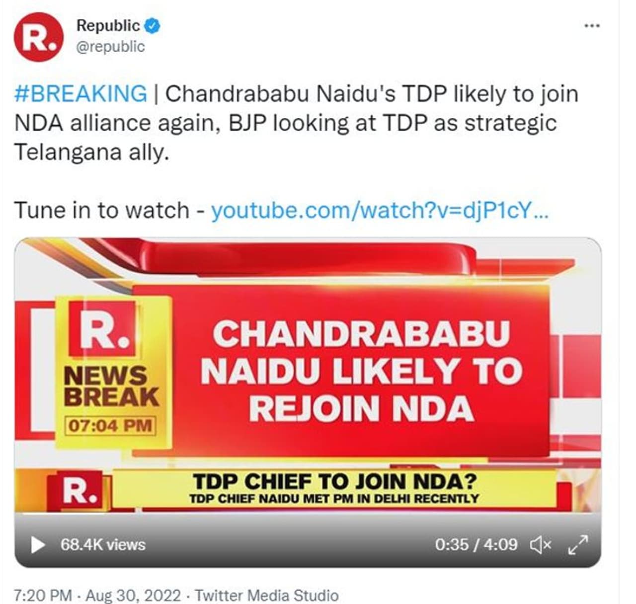 ఇదిలా ఉంటే.. తెలంగాణలో కేసీఆర్ బీజేపీపై తీవ్ర విమర్శలు చేస్తున్న సంగతి తెలిసిందే. బీజేపీపై పోరాడేందుకు విపక్షాల మద్దతు కూడగట్టేందుకు ఆయన ప్రయత్నాలు చేస్తున్నారు. మరోవైపు బీజేపీ మాత్రం తెలంగాణలో అధికారమే లక్ష్యంగా పావులు కదుపుతుంది. ఈ క్రమంలోనే రెండు తెలుగు రాష్ట్రాల్లో టీడీపీతో పొత్తు బీజేపీ పెట్టుకోవాలని భావిస్తుందనే సోషల్ మీడియాలో ప్రచారం సాగుతుంది. ‘‘టీడీపీతో పొత్తు పెట్టుకుంటే.. ఆ పార్టీకి తెలంగాణలో ఉన్న కొద్దిపాటి ఓటు బ్యాంక్, హైదరాబాద్, ఉమ్మడి రంగారెడ్డి జిల్లాల్లో సెటిలర్లలో టీడీపీ మద్దతుదారులను తమవైపు తిప్పుకొవచ్చని బీజేపీ చూస్తుంది. అలాగే ఏపీలో లోక్సభ స్థానాలకు బీజేపీ అభ్యర్థులకు కేటాయించేలా టీడీపీతో పొత్తుకు బీజేపీ ఆలోచన చేస్తుంది. గత ఎన్నికల్లో ఓటమితో ఘోర పరాభం చవిచూసిన టీడీపీ.. రానున్న అసెంబ్లీ ఎన్నికల్లో ఎలాగైనా అధికారం చేజిక్కుంచుకోవాలని చూస్తుంది. ఇందుకోసం బీజేపీతో జత కట్టేందుకు తెర వెనక ప్రయత్నాలు చేస్తుంది’’ అనేది సోషల్ మీడియాతో సాగుతున్న ప్రచారం సారాంశం. ఇక, ఇలాంటి సమయంలో రిపబ్లిక్ చానల్ నుంచి ఎన్డీయేలో తెలుగు దేశం పార్టీ మళ్లీ చేరబోతుందనే కథనం వెలువడటం ఇప్పుడు హాట్ టాపిక్గా మారింది.