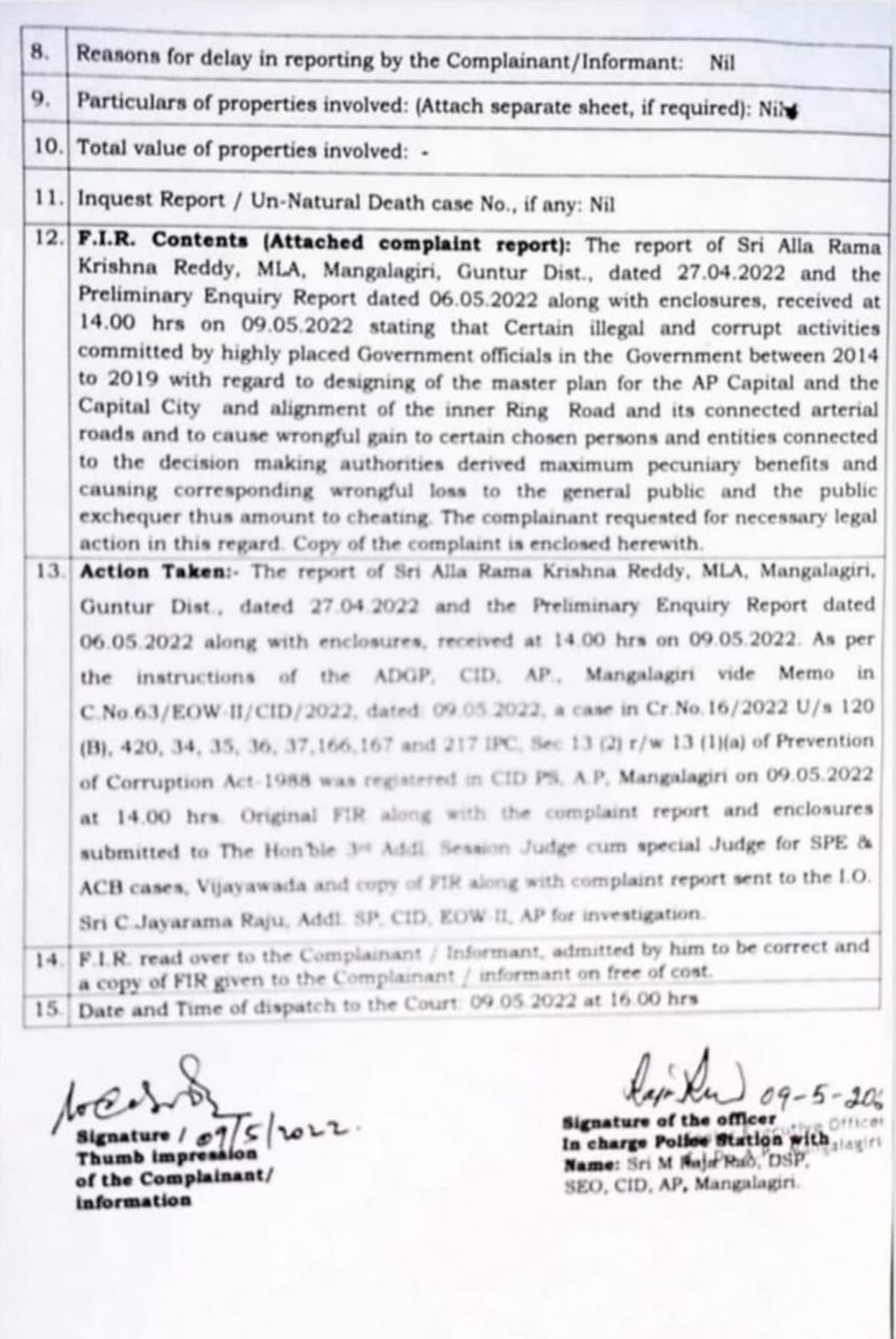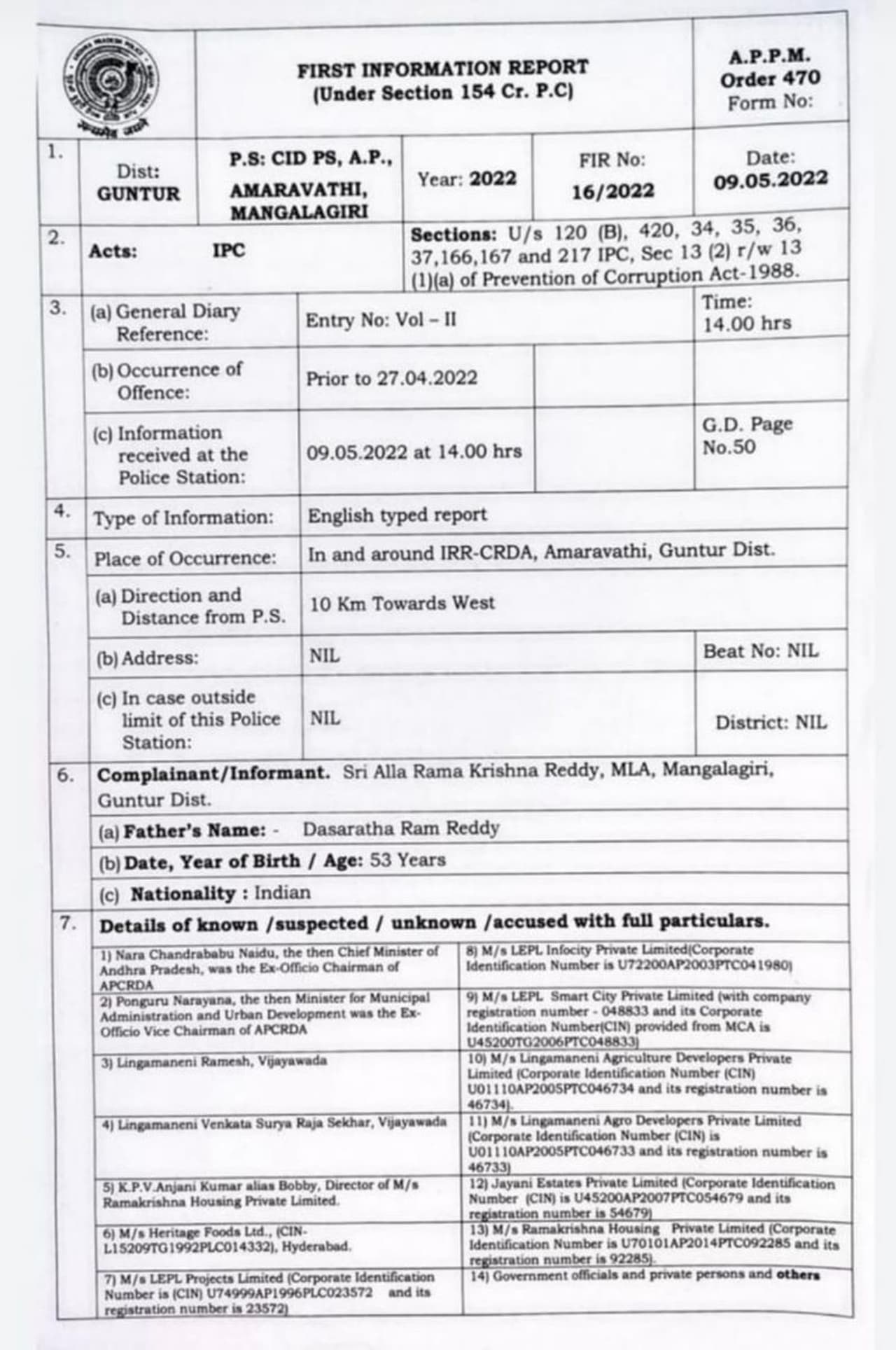 ఇందుకు సంబంధించి గత నెల 27నే ఎమ్మెల్యే ఆర్కే సీఐడీకి ఫిర్యాదు చేశారు. ఈ ఫిర్యాదుపై విచారణ చేపట్టిన పోలీసులు.. అవతవకలు జరిగినట్టుగా ప్రాథమికంగా నిర్దారించినట్టుగా ఎఫ్ఐఆర్లో పేర్కొన్నారు. చంద్రబాబు నాయుడు, నారాయణ, లింగమనేని రమేష్, లింగమనేని వెంకట సూర్యరాజశేఖర్, ఈపీఎల్ ప్రాజెక్ట్స్, రామకృష్ణ హౌసింగ్ ప్రైవేట్ లిమిటెడ్ డైరెక్టర్ అంజనీకుమార్, హెరిటేజ్ ఫుడ్స్ల పై 120బి, 420, 34, 35, 36, 37, 166, 167, 217 ఐపీసీ సెక్షన్లతోపాటు అవినితి నిరోధక చట్టం సెక్షన్ 13(2) రెడ్ విత్ 13(1)(ఏ) కింద కడా కేసు నమోదు చేశారు.