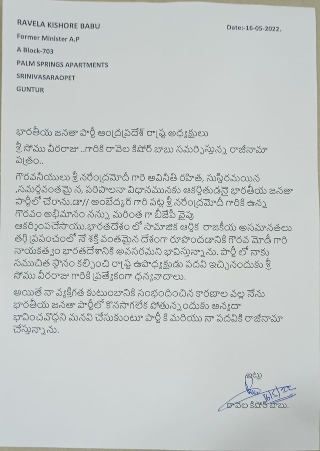 మాజీ మంత్రి రావెల కిషోర్ బాబు బీజేపీకి రాజీనామా చేశారు. ఈ మేరకు ఆయన ఏపీ బీజేపీ అధ్యక్షుడు సోము వీర్రాజుకు లేఖ రాశారు. అంబేడ్కర్ పట్ల ప్రధాని మోదీకి ఉన్న గౌరవం, అభిమానం తనను బీజేపీ వైపు ఆకర్షితుడిని చేశాయని పేర్కొన్నారు. సామాజిక, ఆర్థిక, రాజకీయ అసమానతలు తగ్గి ప్రపంచంలోనే శక్తివంతమైన దేశంగా రూపొందడానికి భారతదేశానికి ప్రధాని మోదీ నాయకత్వం అవసరం అని భావిస్తున్నట్టుగా చెప్పారు. పార్టీకి, తన పదవికి రాజీనామా చేస్తున్నట్టుగా లేఖలో పేర్కొన్నారు పార్టీలో సముచిత స్థానం కల్పించినందుకు ధన్యవాదాలు చెప్పారు. వ్యక్తిగత కారణాలతో బీజేపీలో కొనసాగలేకపోతున్నానని చెప్పారు.