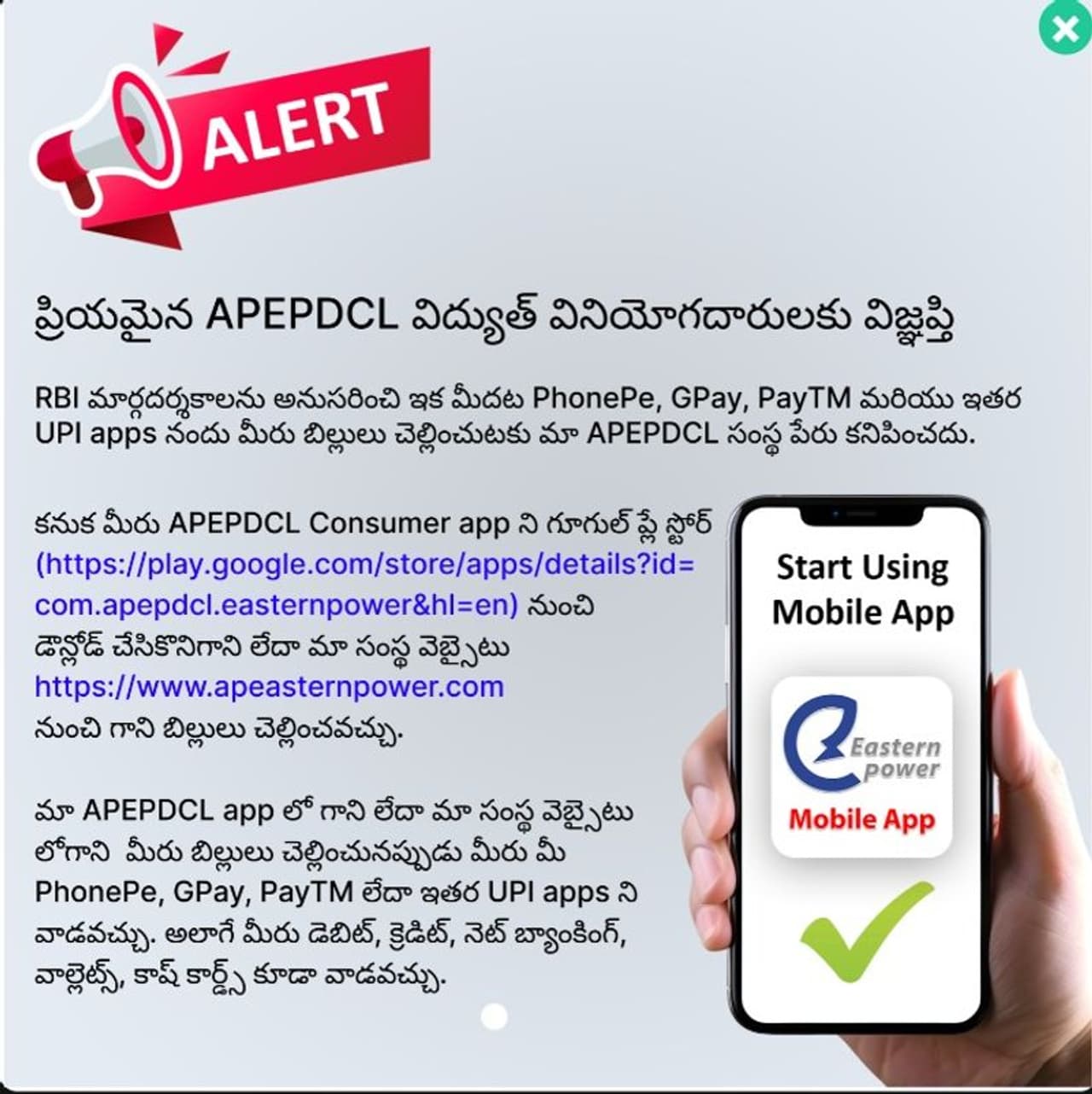 ఈ నేపథ్యంలో ‘‘RBI మార్గదర్శకాలను అనుసరించి ఇకమీదట PhonePe , GPay , PayTM, ఇతర UPI apps నందు మీరు బిల్లులు చెల్లించుటకు మా డిస్కమ్ పేరు కనిపించదు’’ అని APCPDCL పేర్కొంది.