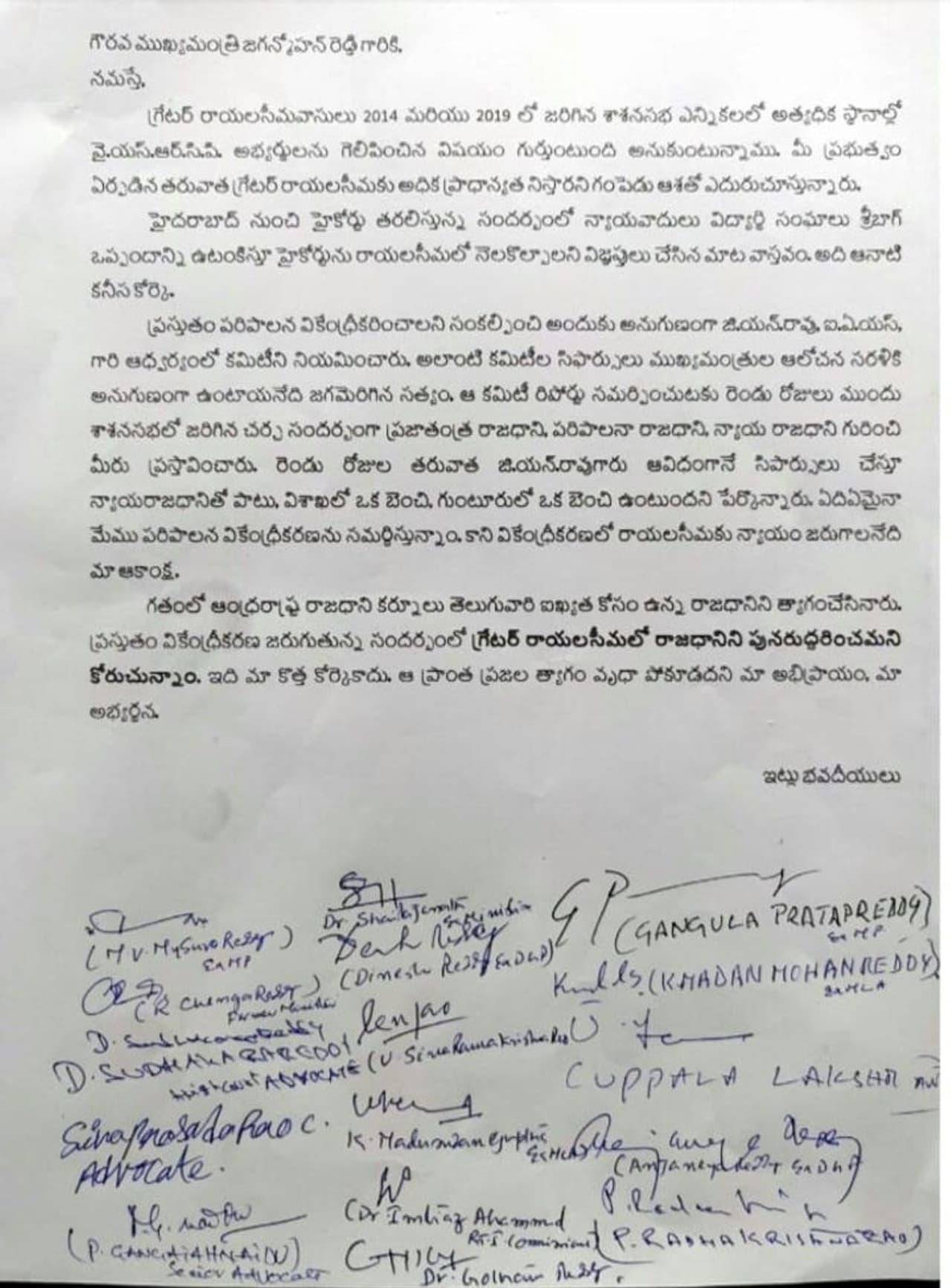 గ్రేటర్ రాయలసీమను రాజధానిగా చేయాలంటూ ఏపీ సీఎం వైఎస్ జగన్మోహన్ రెడ్డికి లేఖ రాశారు రాయలసీమ నేతలు.