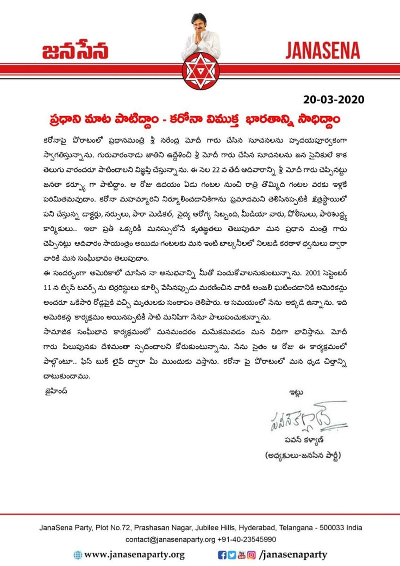 కరోనా మహమ్మారిని నిర్మూలించడానికి గాను ప్రమాదమని తెలిసినప్పటికీ క్షేత్రస్థాయిలో పనిచేస్తున్న డాక్టర్లు, నర్సులు, పారా మెడికల్, వైద్య ఆరోగ్య సిబ్బంది, మీడియా, పోలీసులు, పారిశుద్ధ్య కార్మికులు ఇలా ప్రతి ఒక్కరికీ మనస్సులోనే కృతజ్ఞతలు తెలుపుతూ మన ప్రధాని చెప్పినట్లు ఆదివారం సాయంత్రం 5 గంటలకు మన ఇంటి బాల్కనీలో నిలబడి కరతాళ ధ్వనుల ద్వారా వారికి మన సంఘీభావం తెలుపుదామని పవన్ పిలుపునిచ్చారు.