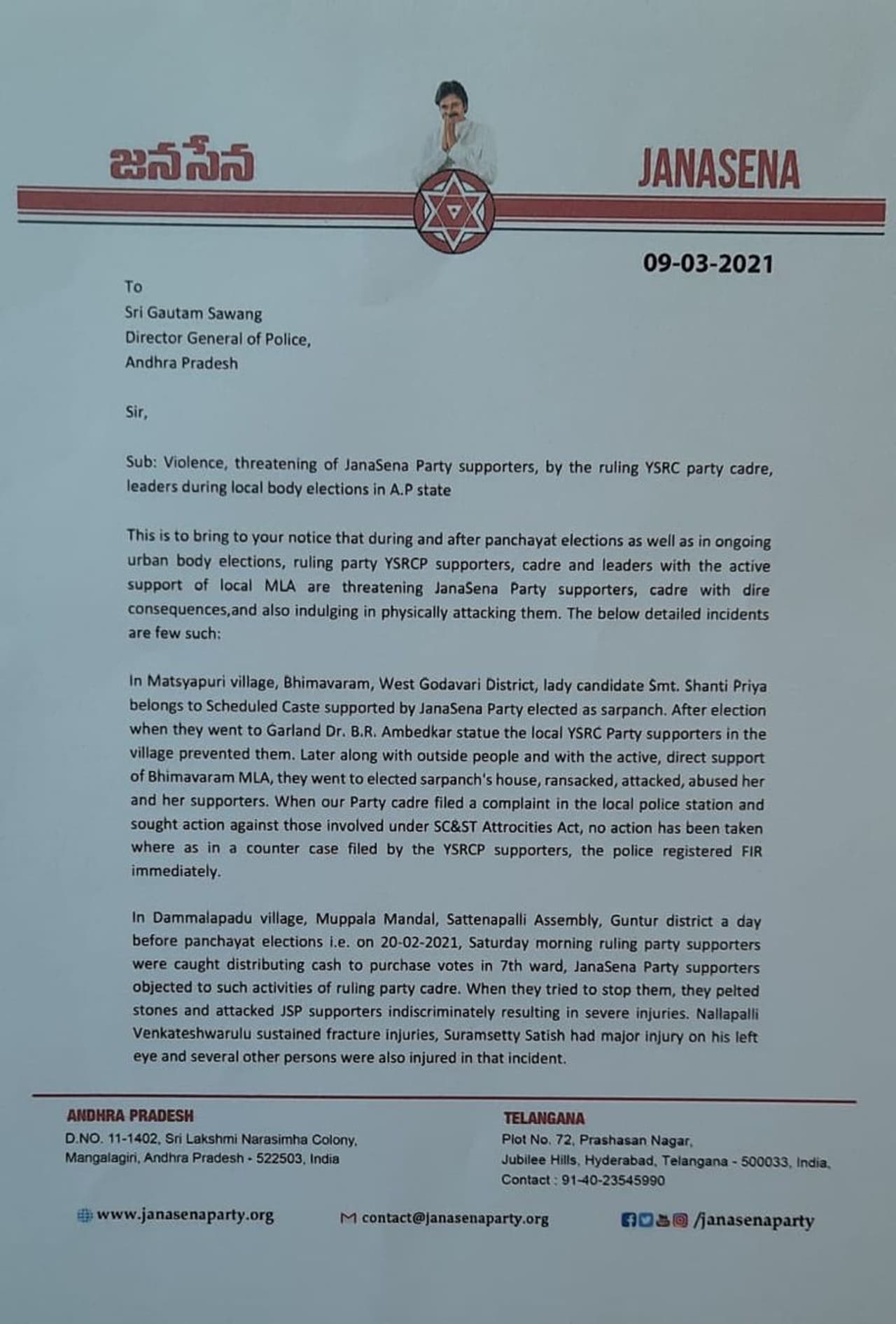 అందులో ఏముందంటే.. ‘‘ పంచాయతీ ఎన్నికలకు ముందు.. ఆ తర్వాత, అదేవిధంగా ప్రస్తుతం నడుస్తున్న పురపాలక సంఘం ఎన్నికల వేళ, అధికార పార్టీ వైఎస్సార్సీపీ మద్దతుదారులు, కార్యకర్తలు, మరియు నాయకులు, స్థానిక ఎమ్మెల్యేల దన్నుతో, జనసేన మద్దతుదారులు, కార్యకర్తలను ఘోరమైన రీతిలో బెదిరిస్తూ.. భౌతిక దాడులకు కూడా తెగబడుతున్నర విషయాన్ని మీ దృష్టికి తీసుకు వస్తున్నాము. ఇలాంటి కొన్ని ఘటనల వివరాలను దిగువ పొందుపరిచాము.