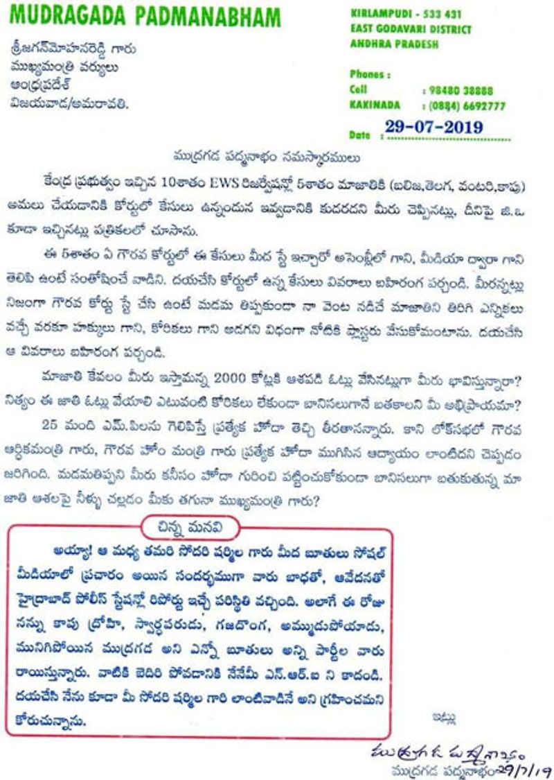 ఆ లేఖలో జగన్ విధానాలపై మండిపడిన ముద్రగడ... అయ్యా జగన్ గారు.. తాను కూడా మీ సోదరి షర్మిల లాంటి వాడినేనని తెలిపారు. కొద్దిరోజుల క్రితం సోదరి షర్మిల మీద సోషల్ మీడియాలో అసభ్యకరమైన వ్యాఖ్యలు వైరల్ కావడంతో ఆమె బాధతో, ఆవేదనతో హైదరాబాద్ పోలీస్ స్టేషన్లో ఫిర్యాదు చేసే పరిస్ధితి వచ్చింది.