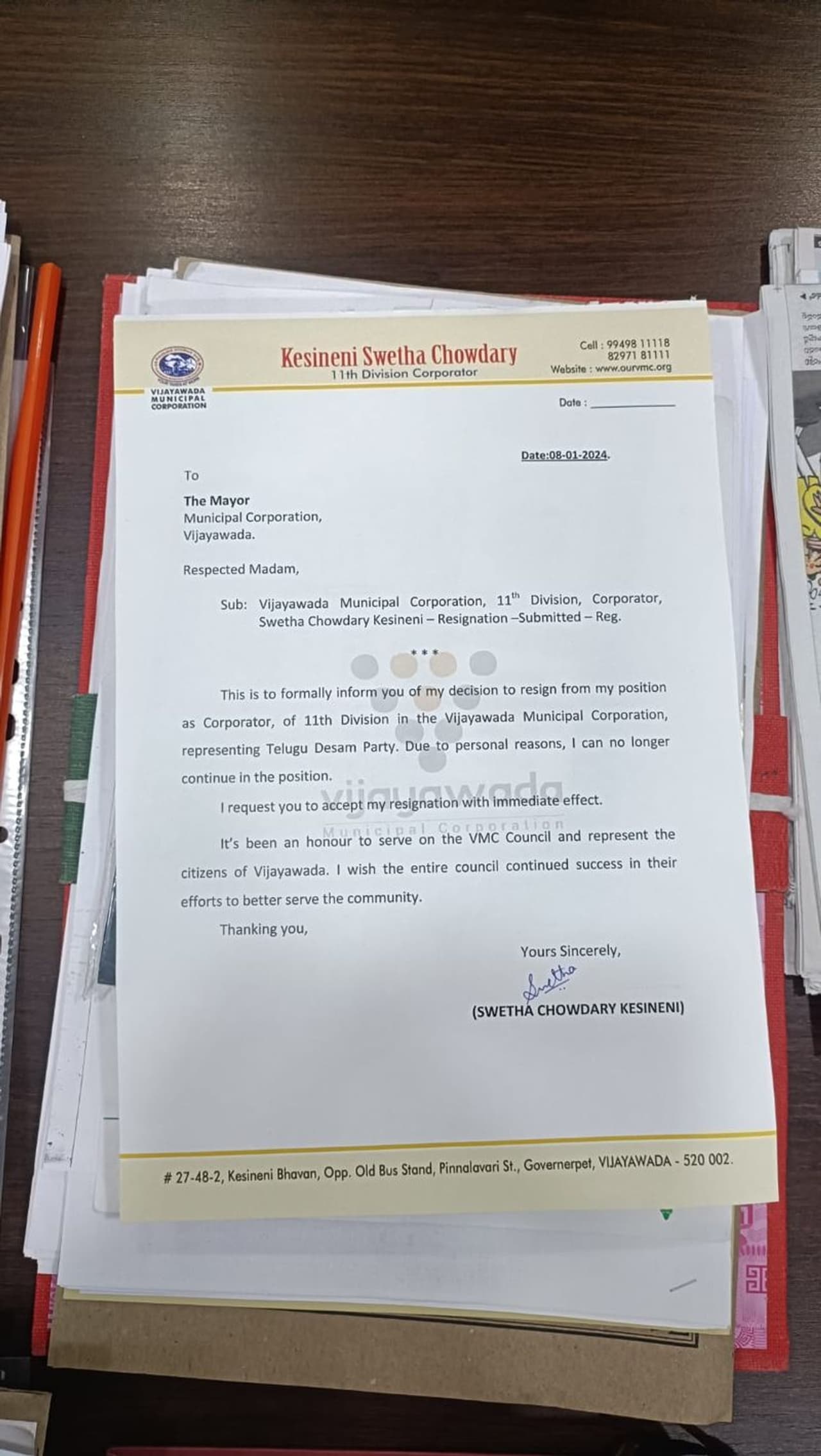 ఇక రాజీనామా పత్రాన్నిమేయర్ కు అందించేందుకు బయలుదేరే ముందు టిడిపి వ్యవస్థాపకులు, మాజీ సీఎం ఎన్టీఆర్ విగ్రహానికి శ్వేత నివాళి అర్పించారు. విగ్రహానికి పూలమాల వేసి దండం పెట్టుకుని బయలుదేరారు. ఇలా కేశినేని భవన్ నుండి రాజీనామా లేఖతో విఎంసి కార్యాలయానికి వెళ్లిన శ్వేత మేయర్ భాగ్యలక్ష్మిని కలిసారు. తన రాజీనామా పత్రాన్ని ఆమెకు అందించి తొందరగా ఆమోదించాల్సిందిగా కేశినేని శ్వేత కోరారు.