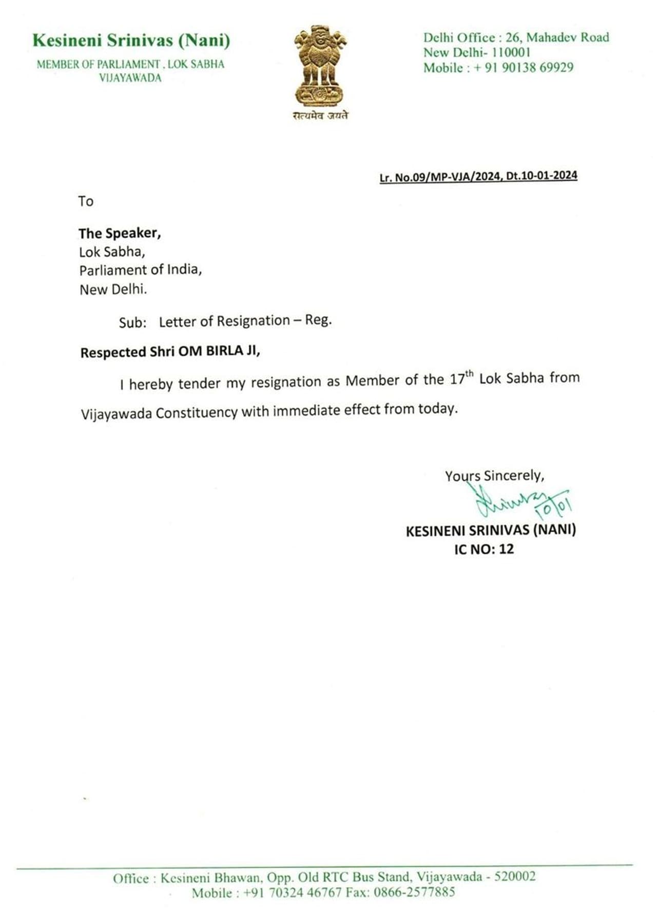 విజయవాడ ఎంపీ కేశినేని నాని బుధవారం తన లోక్సభ సభ్యత్వానికి , తెలుగుదేశం పార్టీ ప్రాథమిక సభ్యత్వానికి రాజీనామా చేశారు. అనంతరం తన రాజీనామా లేఖలను లోక్సభ స్పీకర్ ఓం బిర్లాకు, టీడీపీ చీఫ్ చంద్రబాబుకు పంపారు.