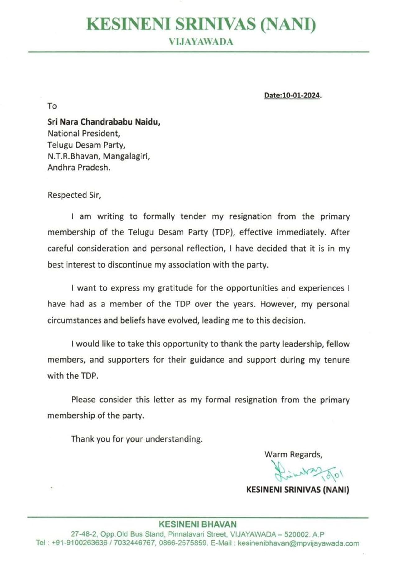 వ్యక్తిగత కారణాలతోనే పార్టీ ప్రాథమిక సభ్యత్వానికి రాజీనామా చేస్తున్నట్లు లేఖలో పేర్కొన్న కేశినేని నాని.. ఇంతకాలం పార్టీలో సహకరించినందుకు చంద్రబాబుకు ధన్యవాదాలు తెలిపారు. అన్ని కోణాల్లోనూ ఆలోచించిన తర్వాతే పార్టీని వీడాలని నిర్ణయించుకున్నానని, పార్టీలో కొనసాగకూడదనే ప్రాథమిక సభ్యత్వానికి రాజీనామా చేసినట్లు వెల్లడించారు.