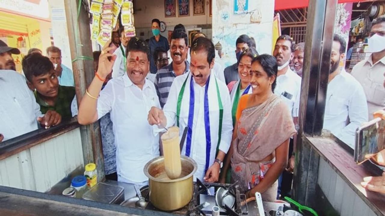 ప్రచారంలో భాగంగా మంత్రులు టీ దుకాణం వద్ద కొద్ది సేపు ఆగి అందరిని అశ్చర్యపరిచారు. టీ స్టాల్ యజమానిని పలకరించారు. అంతేకాదు మంత్రి స్వయంగా ఛాయ్ పెట్టి అక్కడున్న అందరికీ తాగించారు.
