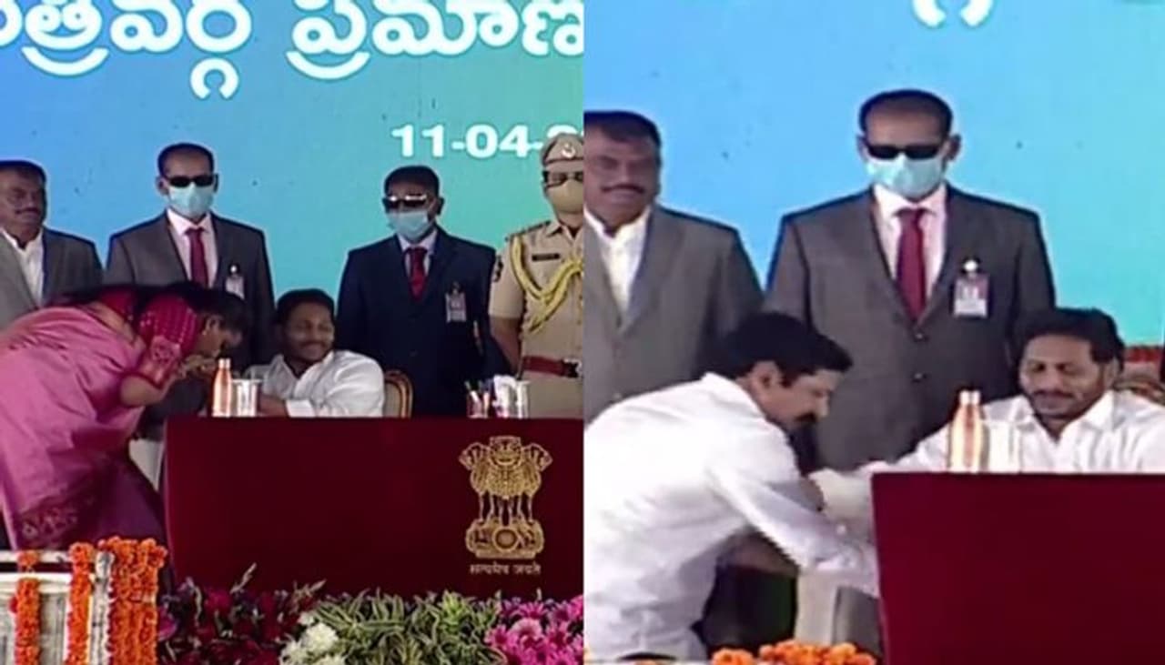 ఆంద్రప్రదేశ్ మంత్రివర్గ ప్రమాణ స్వీకారం సందర్భంగా ఆసక్తికర సన్నివేశాలు చోటుచేసుకున్నాయి. మంత్రులుగా ప్రమాణ స్వీకారం చేసిన అనంతరం కొందరు సీఎం జగన్ పట్ల వారి విధేయతను చాటుకున్నారు.