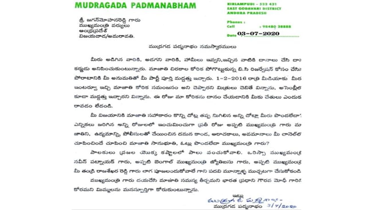 ''పాలకులు ప్రజల కష్టాలలో పాలుపంచుకోవాలి. నవీన్ పట్నాయక్, జ్యోతిబసు, వైఎస్సార్ లా పూజలందుకోవాలి కానీ పదవి మూణాళ్ళ ముచ్చటగా చేసుకోకండి. మాజాతి రిజర్వేషన్ల కోసం ప్రధాని మోడీని కోరండి'' అని సిఎం జగన్ కు రాసిన లేఖ లో ముద్రగడ పేర్కొన్నారు.