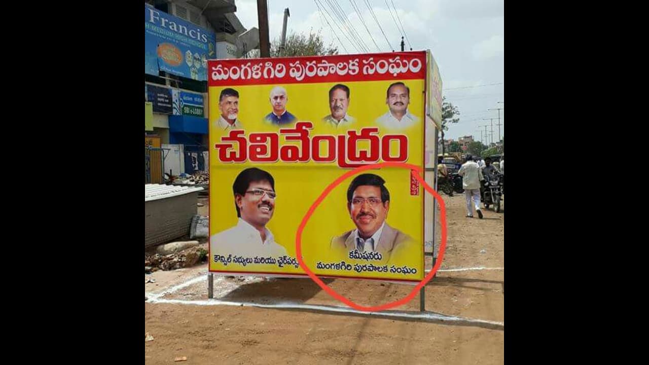 చంద్రబాబునాయుడుకు అత్యంత సన్నిహితుడు, మున్సిపల్ శాఖ మంత్రి పి. నారాయణను మున్సిపల్ అధికారులే ఘోరంగా అవమానించారు. మంత్రిపేరును మంగళగిరి మునిసిపల్ కమిషనర్ గా ప్రచార బోర్డు పై ముద్రించిన ఘనత మంగళగిరి పురపాలక సంఘానికే దక్కుతుంది.