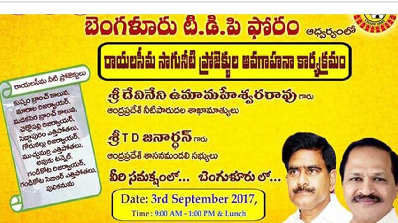 నంద్యాల ఎన్నికల్లో ఘనవిజయం తర్వాత ముఖ్యమంత్రి చంద్రబాబు నాయుడు ఒక బృహత్తర కార్యక్రమం చేపడుతున్నారు. రాయలసీమ ప్రజల అజ్ఞానాన్ని పారదోలేందుకు తెలుగుదేశం పార్టీని ఆయన సమాయత్తం చేస్తున్నారు. ఇందులో భాగంగా రాయలసీమప్రజలను, ముఖ్యంగా అక్కడి టిడిపియేతర నేతలను నీటిపారుదల గురించి ఎజుకేట్ చేసేందుకు బెంగుళూరులో ఒక కార్యక్రమం ఏర్పాటు చేస్తున్నారు.తెలుగుదేశం ప్రభుత్వం అమలుచేస్తున్న నీటి పారుదల పథకాలు ఎలా రాయలసీమను కృష్ణాజలాలలో ముంచెత్తనున్నాయో వివరించేందుకు సెప్టెంబర్ మూడో తేదీన బెంగుళూరులోని కృష్ణ సమిట్ బాంక్వెట్ హాల్ లో ‘రాయలసీమ సీమ సాగునీటి ప్రాజక్టుల అవగాహన కార్యక్రమం’ ఏర్పాటుచేస్తున్నారు. బెంగుళూరు టిడిపి ఫోరం ఈ కార్యక్రమం నిర్వహిస్తుంది. రాష్ట్ర నీటిపారుదల శాఖ మంత్రి దేవినేని ఉమామహేశ్వరరావు, పార్టీ ఎమ్మెల్సీ టిడి జనార్దన్ ల ఆధ్వర్యంలో ఈ కార్యక్రమం సాగుతుంది.