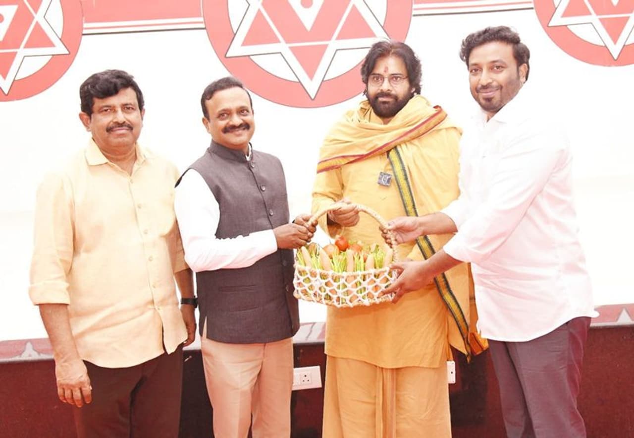 కాగా, జనసేన అధినేత పవన్ కళ్యాణ్తో భేటీ సందర్భంగా ఎంపీలిద్దరూ కూరగాయల గుచ్ఛాన్ని అందజేశారు. ఈ సందర్భంగా పవన్ కళ్యాణ్ మాట్లాడుతూ.. తనను కలిసేందుకు వచ్చేవారు కళ్లకు ఇంపుగా కనిపించేవి, కనులకు నిండుగా కనబడేవి తేవొద్దని సూచించారు. ఇలా పది మందికి కడుపు నింపేవి తీసుకొస్తే బాగుంటుందన్నారు. ఎంపీలు ఇచ్చిన కూరగాయల బొకే ఆనందానికి గురిచేసిందని తెలిపారు. వారి స్ఫూర్తిని మిగతా వారు కూడా కొనసాగించాలన్నారు. ‘పూల బొకేలతో డబ్బు వృథా చేయొద్దు. విగ్రహాల కోసం ఇబ్బందిపడొద్దు. శాలువాలు అసలే తేవద్దు. వాటికి వెచ్చించే మొత్తంతో కష్టాల్లో ఉన్న ప్రజలకు ఉపయోగపడే పనులు చేయండి. రాష్ట్ర ప్రభుత్వం తరఫున త్వరలో అన్న క్యాంటిన్లు రానున్నాయి. వాటికి ఉపయోగపడేలా టోకెన్స్ లాంటివి తీసుకొని ఇవ్వండి’ అని పవన్ కళ్యాణ్ సూచించారు. ఈ సమావేశంలో ఎంపీలు వల్లభనేని బాలశౌరి, శ్రీ తంగెళ్ల ఉదయ్ శ్రీనివాస్తో పాటు ఎమ్మెల్సీ పి.హరిప్రసాద్ కూడా పాల్గొన్నారు.