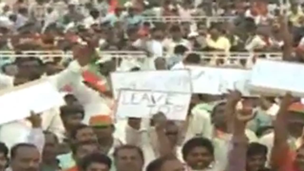 భారతీయ జనతా పార్టీ బహిరంగ సభలో టిడిపికి వ్యతిరేకంగా ప్ల కార్డుల ప్రదర్శన. విచిత్రంగా లేదు. అంటే భారతీయ జనతా పార్టీ సీనియర్ నేత, కేంద్రమంత్రి వెంకయ్యనాయడుపై పార్టీలో ఎంత కోపముందో అర్బాధమవుతోంది. ఎందుకంటే, యువత చేసిన నినాదాలు వెంకయ్య మాట్లాడుతున్నపుడు పెద్ద ఎత్తున వినిపించారు కాబట్టి.