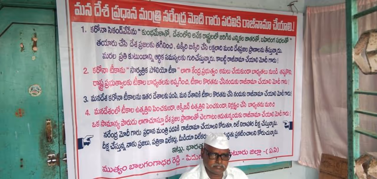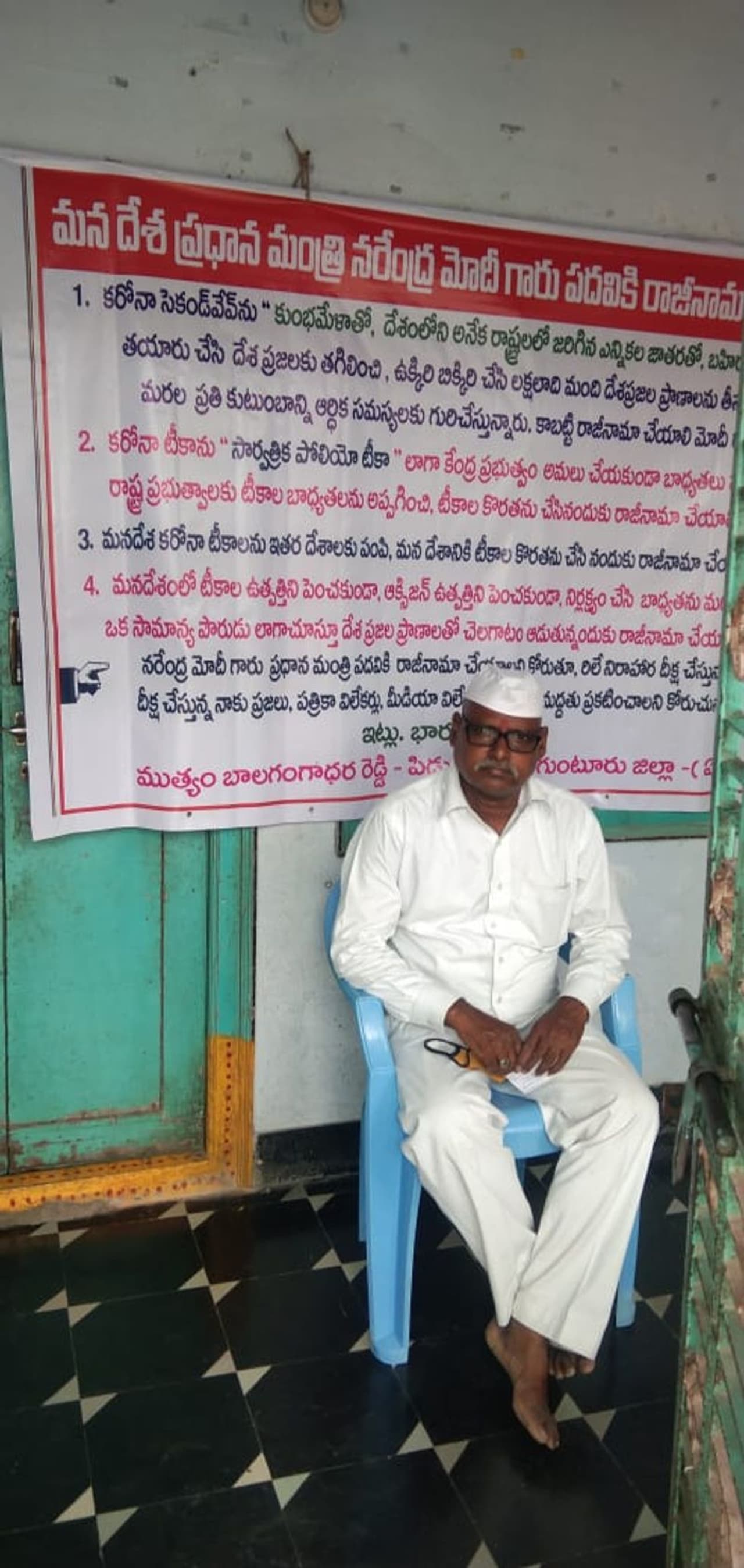 వివరాల్లోకి వెళితే... గుంటూరు జిల్లా పిడుగురాళ్ళ పట్టణానికి చెందిన ముత్యం బాలగంగాధర్ రెడ్డి దేశంలో కరోనా విలయతాండవాన్ని చూసి చలించిపోయాడు. దేశంలో కరోనా మారణహోమానికి ప్రధానే కారణమని భావించిన అతడు మోదీ రాజీనామాకు డిమాండ్ చేస్తున్నాడు. ఇందుకోసం ఇంట్లోనే ఉండి నిరాహారదీక్ష చేస్తున్నాడు. నేటి(బుధవారం) నుండి పదిరోజుల పాటు ఇంటి నుండే తన దీక్షను కొనసాగిస్తానని బాలగంగాధర్ వెల్లడించారు.
