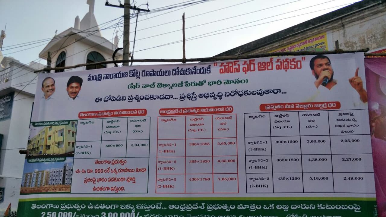 నెల్లూరు పట్టణంలో వెలసిన ఈ పోస్టర్ అందరినీ ఆకట్టుకుంటోంది. పేదలందరికీ ఇళ్ళు అనేక పథకంలో భాగంగా ప్రభుత్వం లక్షలాది ఇళ్ళను నిర్మించాలనుకుంది. అందుకు లబ్దిదారుల నుండి కూడా కొంత సొమ్మును కట్టించుకుంటోంది. కట్టాల్సిన డబ్బులు ఎక్కువుగా ఉందని లబ్దిదారులు మొత్తుకుంటున్నా ప్రభుత్వం పట్టించుకోవటం లేదు. తెలంగాణా అయినా ఏపిలో అయినా అమలు చేయాల్సింది ఒకే పథకం. పథకాన్ని అమలు చేయటంలో రెండు ప్రభుత్వాలు అనుసరిస్తున్న తీరు బోర్డును చూస్తే తెలిసిపోతుంది. మీరే చూడండి ఎంత వ్యత్యాసమో?