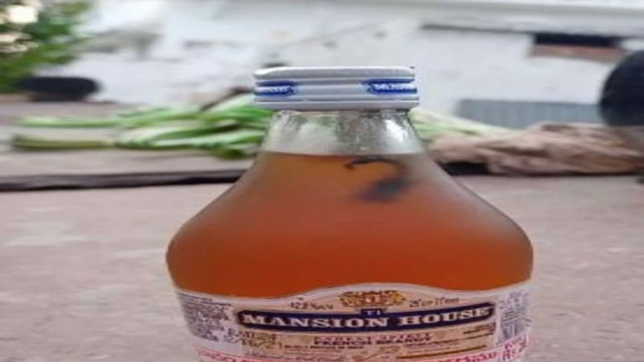 ప్రకాశం జిల్లా మండల కేంద్రమైన పుల్లలచెరువు లోని ప్రభుత్య మద్యంషాపులో గురువారం కొందరు మద్యంప్రియులు "మ్యాన్షన్ హౌస్" బాటిళ్లను కొనుగోలు చేశారు. గ్లాసులు, నీళ్లు, స్టఫ్ తీసుకుని తాగేందుకు సమాయత్తమయ్యారు. తీరా మందుబాటిల్ ను ఓపెన్ చేసేందుకు ప్రయత్నించగా అందులో విషాపురుగైన తేలు కనిపించింది. దీంతో సదరు మందుబాబులు అవాక్కయ్యారు.