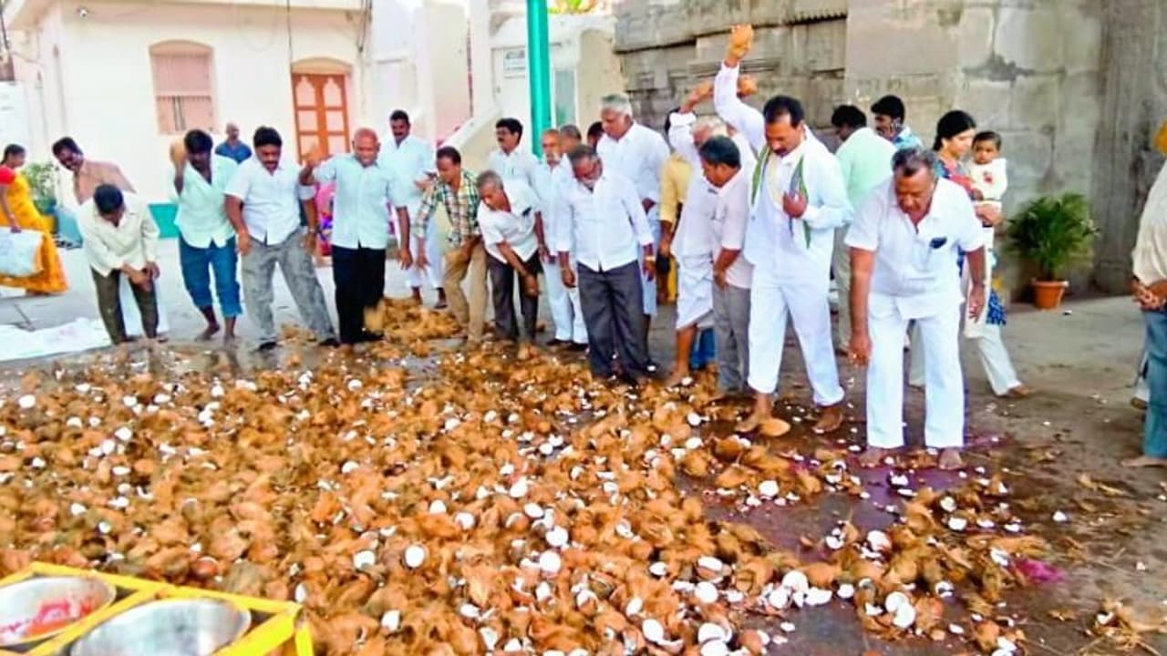 గుంటూరు జిల్లా మంగళగిరి లక్ష్మీనరసింహ స్వామి ఆలయంలో జగన్ అభిమానులు 3648 కొబ్బరికాయలు కొట్టి మొక్కు తీర్చుకున్నారు. జగన్ 3,648 కిలోమీటర్లు నడిచారు కాబట్టి.. అన్ని కొబ్బరి కాయలు కొట్టి మొక్కు తీర్చుకున్నారు. ప్రజాసంకల్పయాత్ర ప్రారంభమైన రోజు పాదయాత్ర విజయవంతం కావాలని స్వామివారికి మొక్కుకున్నారు. పాదయాత్ర విజయవంతం కావడంతో కార్యకర్తలు స్వామి వారికి కొబ్బరికాయలు కొట్టి తమ మొక్కు చెల్లించుకున్నారు.