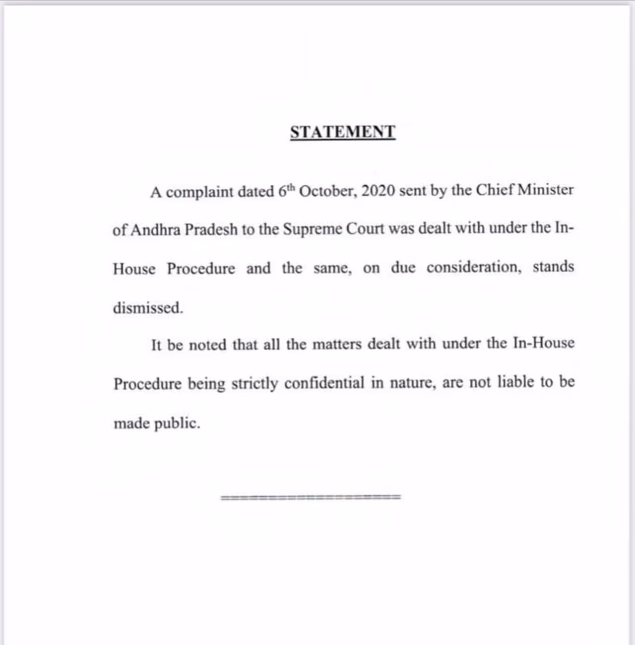 సుప్రీంకోర్టు విడుదల చేసిన ప్రకటనలో తెలిపిన వివరాల ప్రకారం... అమరావతి భూముల విషయంలో జస్టిస్ ఎన్వీ రమణపై ఆంధ్ర ప్రదేశ్ ముఖ్యమంత్రి జగన్మోహన్ రెడ్డి 2020 అక్టోబరు 6న సుప్రీంకోర్టుకు ఫిర్యాదు చేశారు. దీనిపై ఇన్-హౌస్ ప్రొసీజర్లో విచారణ జరిపి, తగిన విధంగా పరిశీలించి, సుప్రీంకోర్టు తోసిపుచ్చింది.