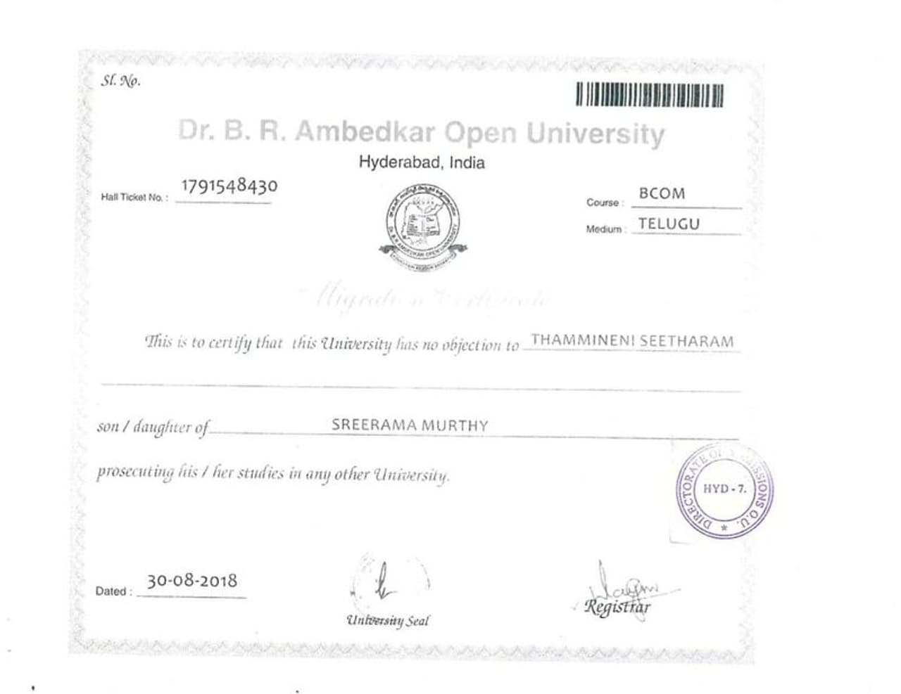 సమాచార హక్కు చట్టం ద్వారా మహాత్మాగాంధీ లా కాలేజీలో స్పీకర్ తమ్మినేని సమర్పించిన సర్టిఫికెట్లను పొందినట్లు నర్సిరెడ్డి తెలిపారు. నాగర్ కర్నూల్ స్టడీ సెంటర్ నుండి అంబేద్కర్ ఓపెన్ యూనివర్సిటీ ద్వారా 2015-18 విద్యాసంవత్సరంలో తమ్మినేని బీకాం డిగ్రీ చదవినట్లు సర్టిఫికెట్స్ లో వుందన్నారు. అయితే అసలు తమ్మినేని సీతారం డిగ్రీ చదివినట్లు నాగర్ కర్నూల్ స్టడి సెంటర్ లోని ఏ రికార్డుల్లో లేదని తమ విచారణలో తేలినట్లు నర్సిరెడ్డి తెలిపారు.