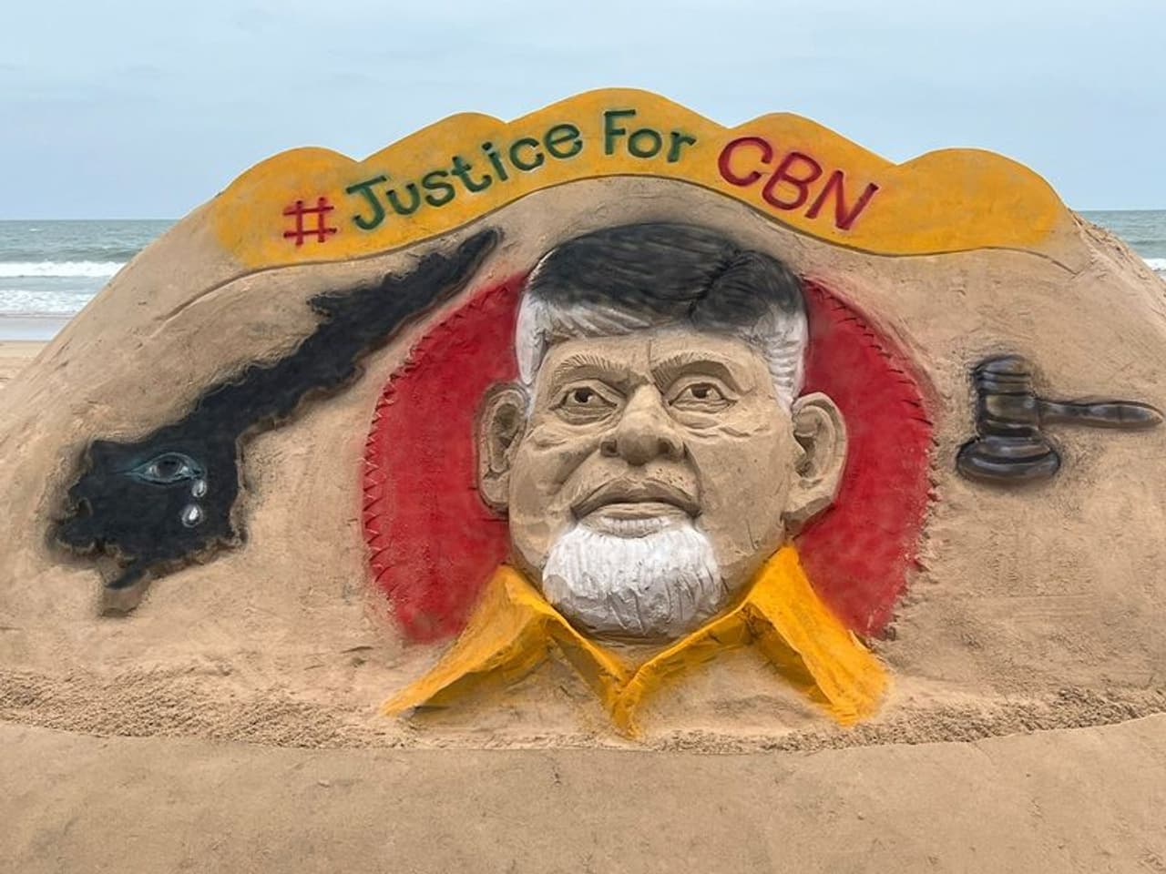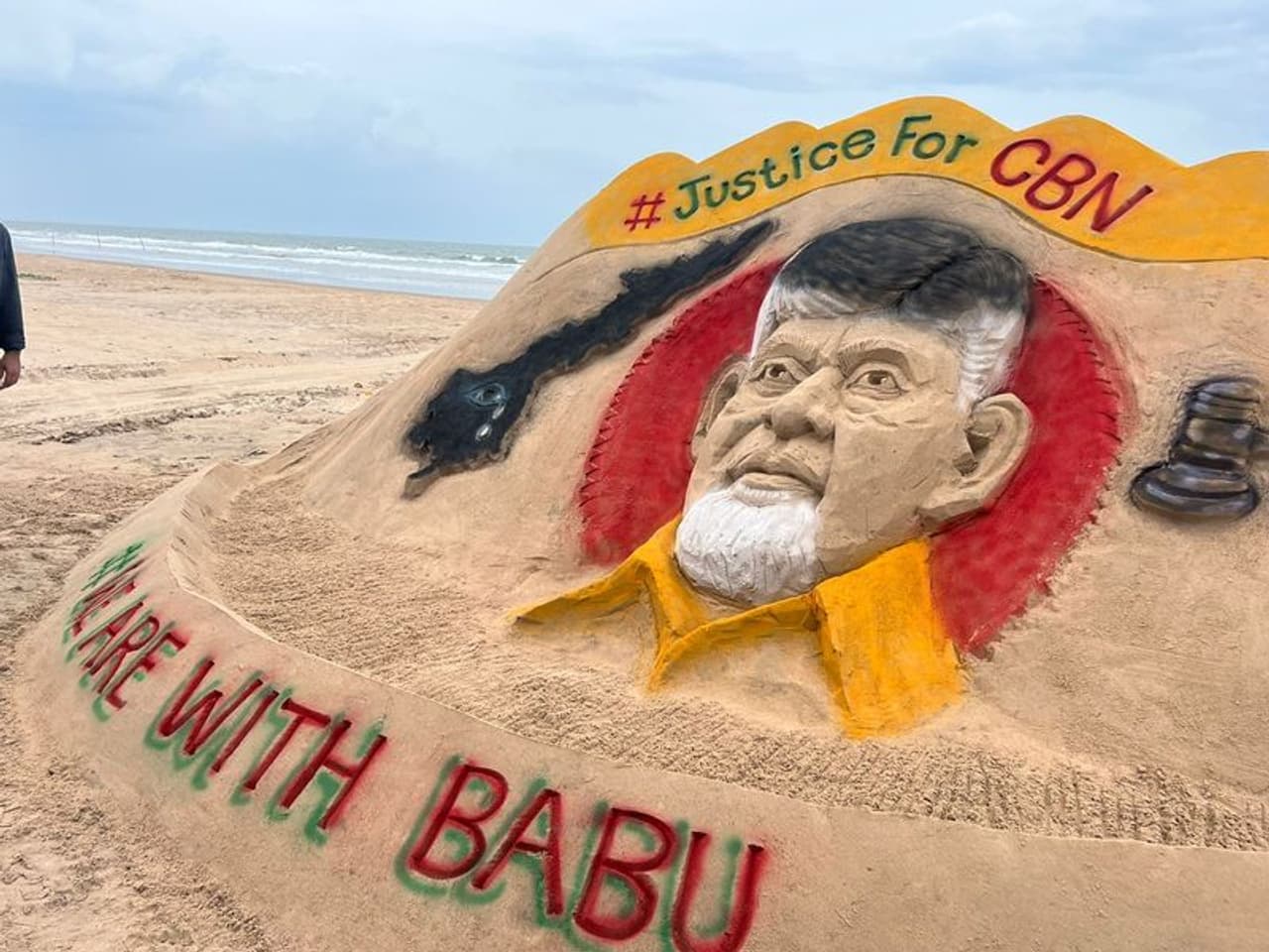 స్కిల్ డెవలప్మెంట్ స్కాంలో టీడీపీ అధినేత చంద్రబాబు నాయుడు అరెస్ట్ను నిరసిస్తూ ఆ పార్టీ శ్రేణులు నిరసనలు, ధర్నాలు చేస్తున్న సంగతి తెలిసిందే. ఏపీతో పాటు ఇతర రాష్ట్రాల్లోనూ చంద్రబాబుకు మద్ధతుగా నిరసన ప్రదర్శనలు జరుగుతున్నాయి. ఈ నేపథ్యంలో బాపట్ల టీడీపీ ఇన్ఛార్జ్ వేగేశ్న నరేంద్ర వర్మ వినూత్న నిరసన తెలిపారు. ఇందుకోసం ఆయన బాపట్ల సముద్ర తీరంలో బీచ్ ఆర్ట్ వేయించారు. ప్రముఖ సైకత శిల్పి బాలాజీ వరప్రసాద్ దీనిని రూపొందించారు. #Justice for CBN అనే హ్యాష్ట్యాగ్తో ఏపీ మ్యాప్, పక్కన కోర్టుల్లో న్యాయమూర్తులు వినియోగించే సుత్తిని రూపొందించారు. ఈ కార్యక్రమంలో టీడీపీ రాష్ట్ర ప్రధాన కార్యదర్శి చింతకాయల విజయ్, ఐటీడీపీ కార్యకర్తలు పాల్గొన్నారు .