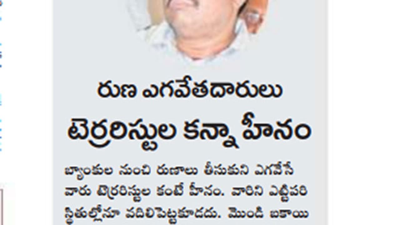 ‘రుణ ఎగవేతదారులు టెర్రరిస్టుల కన్నా హీనం’.. ఈ స్టేట్ మెంట్ ఎవరిదో గమనించారా? విశాఖపట్నం జిల్లాలోని అనకాపల్లి టిడిపి ఎంపి అవంతి శ్రీనివాస్ ది. బ్యాంకుల్లో రుణాలు తీసుకుని ఎగవేసే వారి గురించి ఎంత ఘాటైన వ్యాఖ్యలు చేసారో. రుణ ఎగవేతదారులు, పెరిగిపోతున్న బ్యాంకుల మొండి బకాయిల విషయంలో ఎంపికి గుండె ఎంతమండిపోతే ఈ స్ధాయి స్టేట్మెంట్ ఇస్తారు?