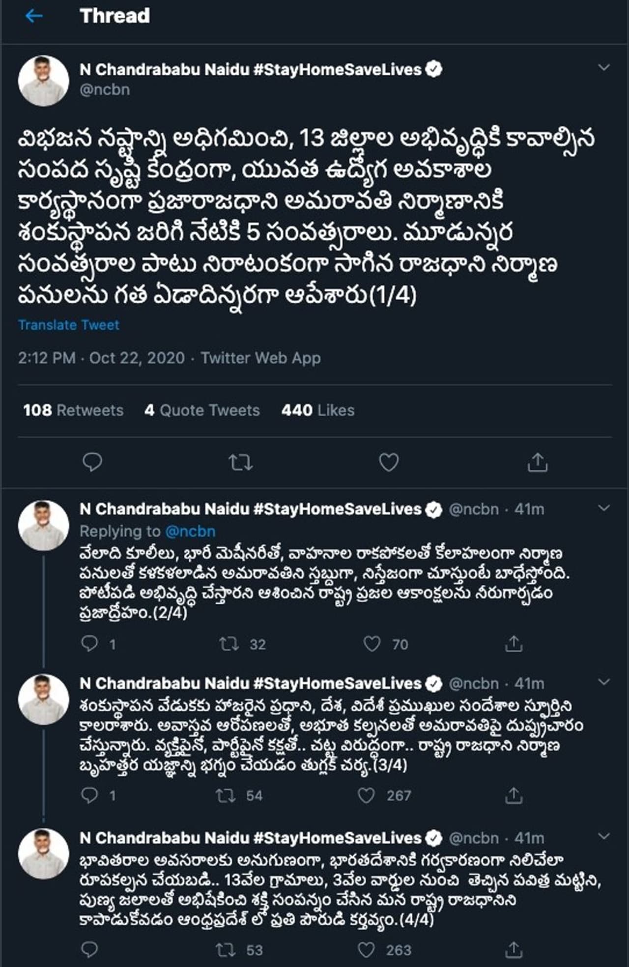 వేలాది కూలీలు, భారీ మెషీనరీతో, వాహనాల రాకపోకలతో కోలాహలంగా నిర్మాణ పనులతో కళకళలాడిన అమరావతిని స్తబ్దుగా, నిస్తేజంగా చూస్తుంటే బాధేస్తోంది. పోటీబడి అభివృద్ధి చేస్తారని ఆశించిన రాష్ట్ర ప్రజల ఆకాంక్షలను నీరుగార్చడం ప్రజాద్రోహం.