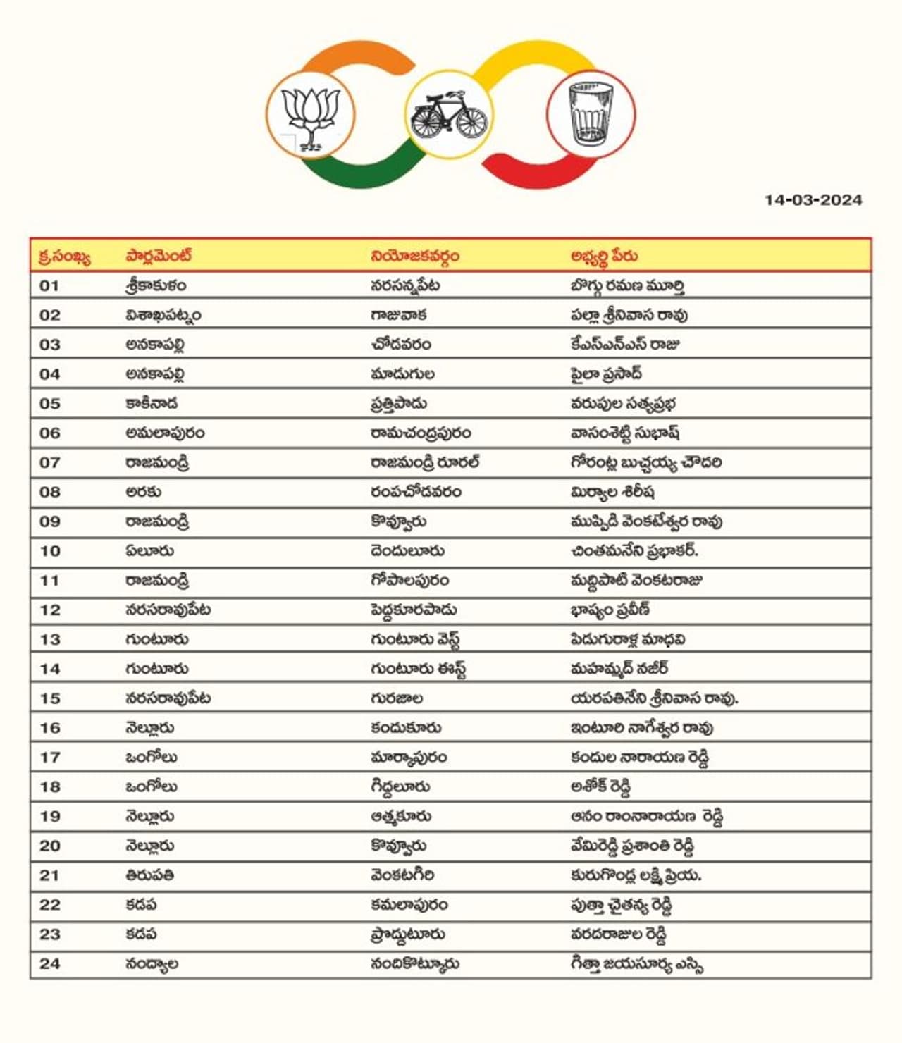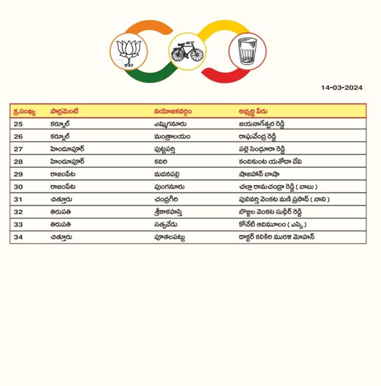 ఆంధ్రప్రదేశ్ అసెంబ్లీ ఎన్నికల నేపథ్యంలో తెలుగుదేశం పార్టీ తమ అభ్యర్థుల రెండో జాబితాను విడుదల చేసింది. ఇందులో 34 మందికి చోటు కల్పించింది. టీటీడీ అధినేత చంద్రబాబు నాయుడు ‘ఎక్స్’ (ట్విట్టర్) వేదికగా ఈ జాబితాను విడుదల చేశారు. ఈ జాబితాలో ప్రజల అభిప్రాయాలకు ప్రాధాన్యత ఇచ్చామని పేర్కొన్నారు. వారందరినీ ఆశీర్వదించాలని కోరారు.