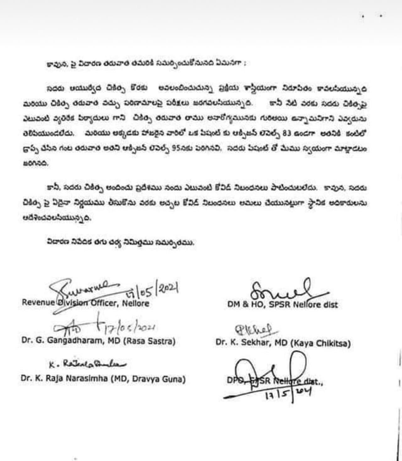 ఆనందయ్య అందిస్తున్న మందుపై స్థానిక అధికారులు ఓ నివేదికను తయారు చేసి జిల్లా కలెక్టర్ కు సమర్పించారు. సదరు ఆయుర్వేద చికిత్స కోసం అవలంబిస్తున్న ప్రక్రియ శాస్త్రీయంగా నిరూపితం కావాల్సి ఉందని, చికిత్స తర్వాత వచ్చే పరిణామాలపై పరీక్షలు జరగాల్సి ఉందని వారన్నారు. కానీ నేటి వరకు ఎటువంటి వ్యతిరేక ఫిర్యాదులు గానీ చికిత్స తర్వాత తాము అనారోగ్యానికి గురయ్యామని గానీ ఎవరు కూడా తెలియజేయలేదని చెప్పారు.