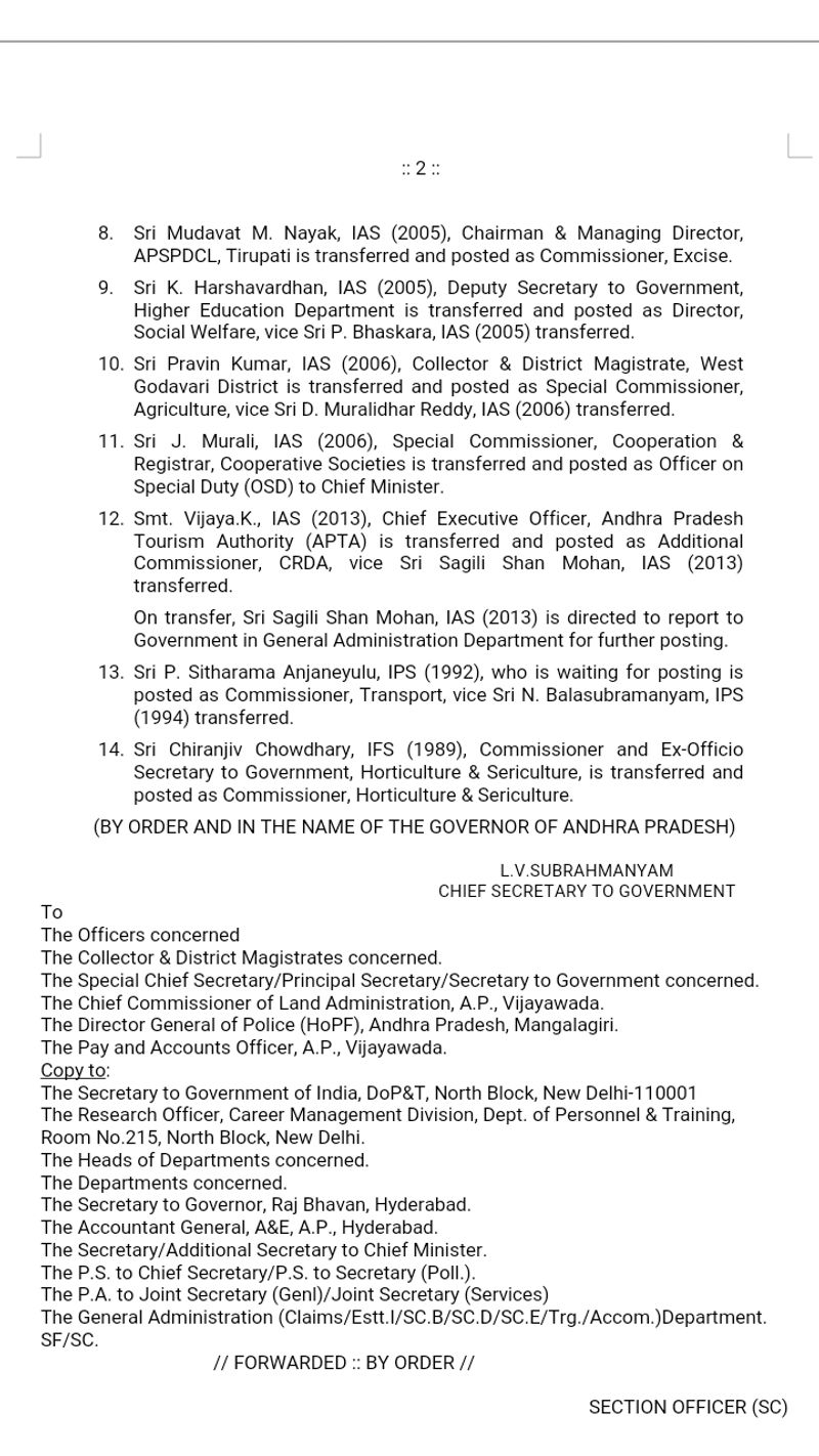 అలాగే మున్సిపల్ శాఖ స్పెషల్ సెక్రటరీ కరికాల వలన్ ను బీసీ సంక్షేమ శాఖకు బదిలీ చేసింది. ప్రభుత్వ జనరల్ అడ్మినిస్ట్రేషన్ సెక్రటరీగా ఉన్న పి.లక్ష్మీనరసింహంను బదిలీ చేశారు. ఆయనను సీఆర్డీఏ కమిషనర్ గా నియమించింది.