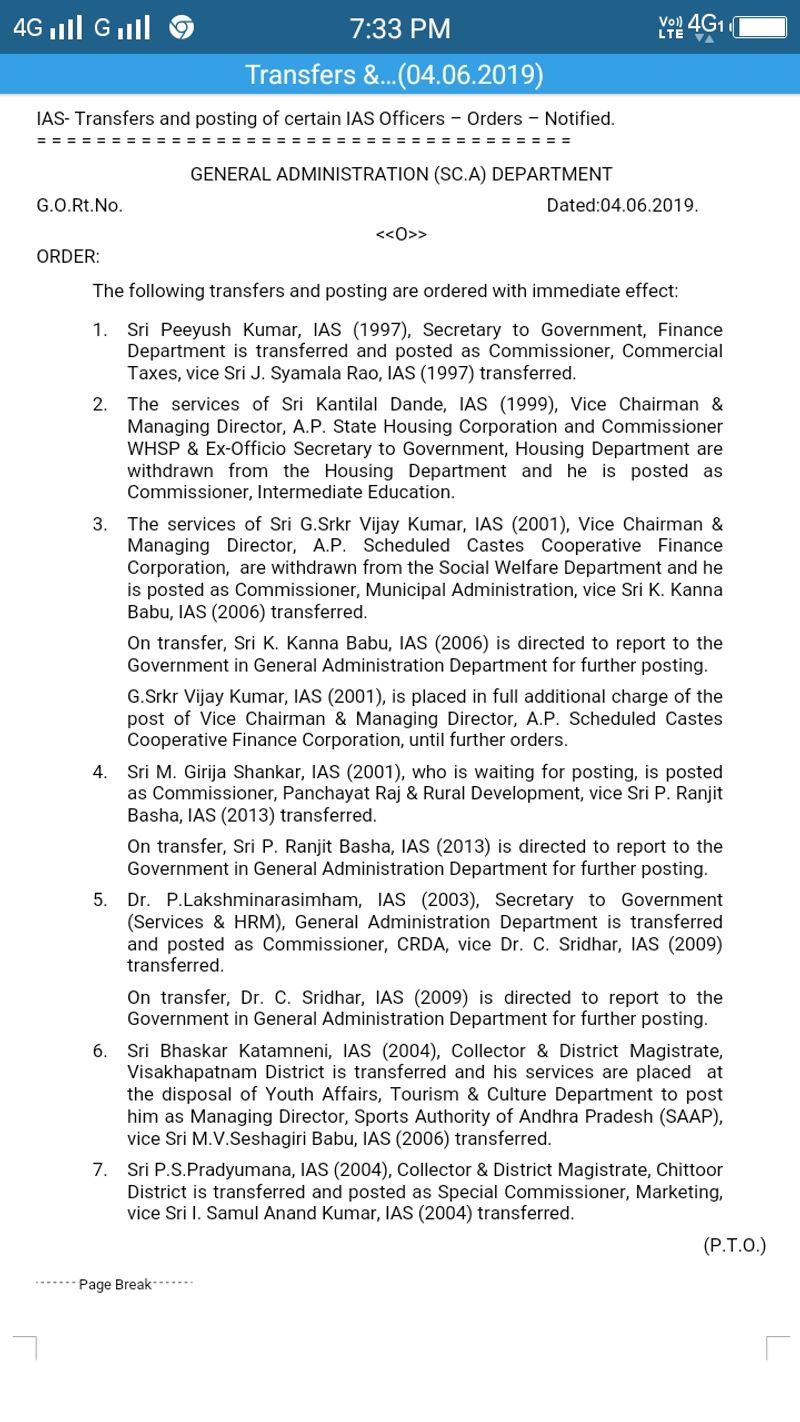ఇంటర్మీడియట్ బోర్డ్ కమిషనర్ గా కాంతిలాల్ దండేను నియమించింది. ఇకపోతే ఆంధ్రప్రదేశ్ ఎస్సీ కార్పొరేషన్ ఎండీగా పనిచేస్తున్న ఎస్ఆర్కేఆర్ విజయ్ కుమార్ పై బదిలీవేటు వేసింది. ఆయనను పురపాలక శాఖ కమిషనర్ గా నియమించింది.