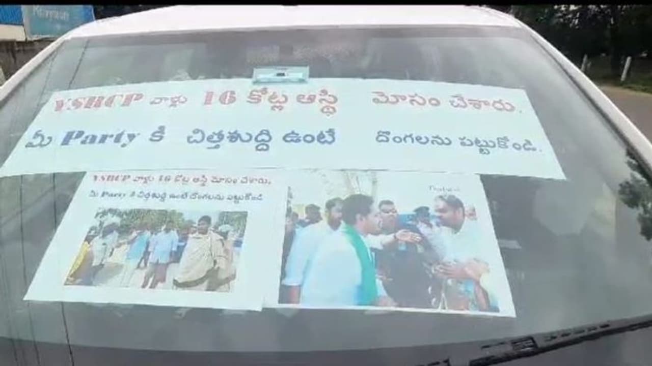 కర్నూల్ జిల్లా ఆళ్లగడ్డకు చెందిన మల్లికార్జున్ రెడ్డి తమను రూ.16 కోట్లు మోసం చేసాడంటూ రెనాల్ట్ క్విడ్ కారుచుట్టూ పేపర్లు అతికించారు. గతంలో సీఎం జగన్ ను మల్లికార్జున్ రెడ్డి కలిసిన ఓ ఫోటోను కూడా కారుకు అతికించారు. వైసిపి వాళ్లచేతిలో కోట్లలో ఆస్తిని కోల్పోయామని... మీ పార్టీకి చిత్తశుద్ది వుంటే దొంగను పట్టుకోవాలంటూ కారు ముందు పేపర్లు, పోటోలు అతికించారు.