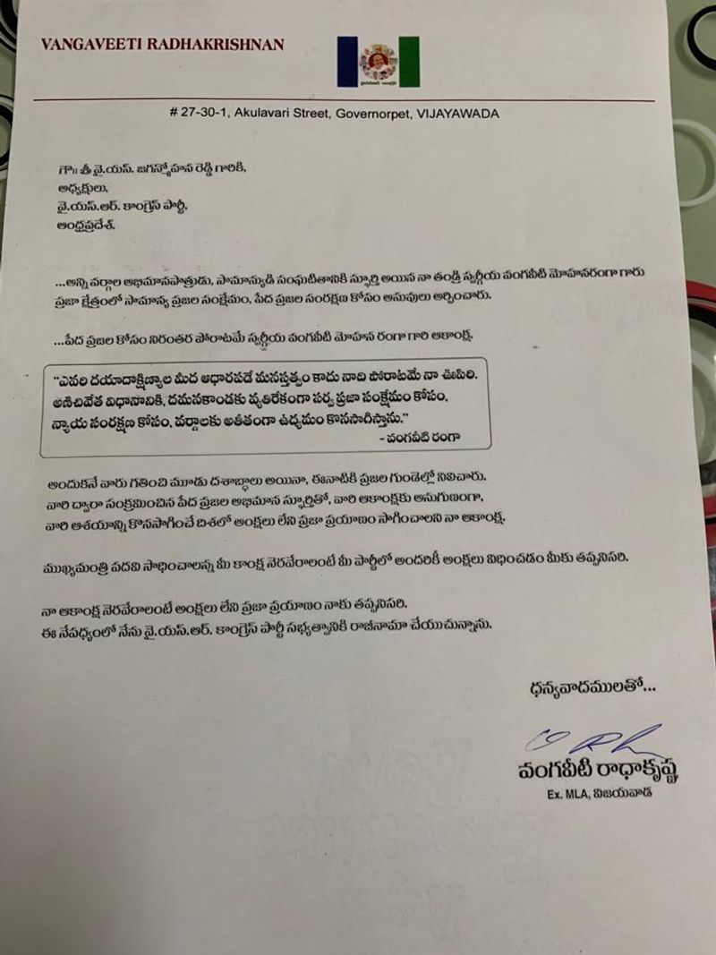 వైసీపీకి వంగవీటి రాధా ఆదివారం నాడు రాజీనామా చేశారు. రాజీనామా లేఖను వైసీపీ చీఫ్ వైఎస్ జగన్కు పంపారు. ఇవాళ ఉదయం నుండి పలువురు పార్టీ నేతలు ఆయనను బుజ్జగించినా కూడ ఆయన వెనక్కు తగ్గలేదు